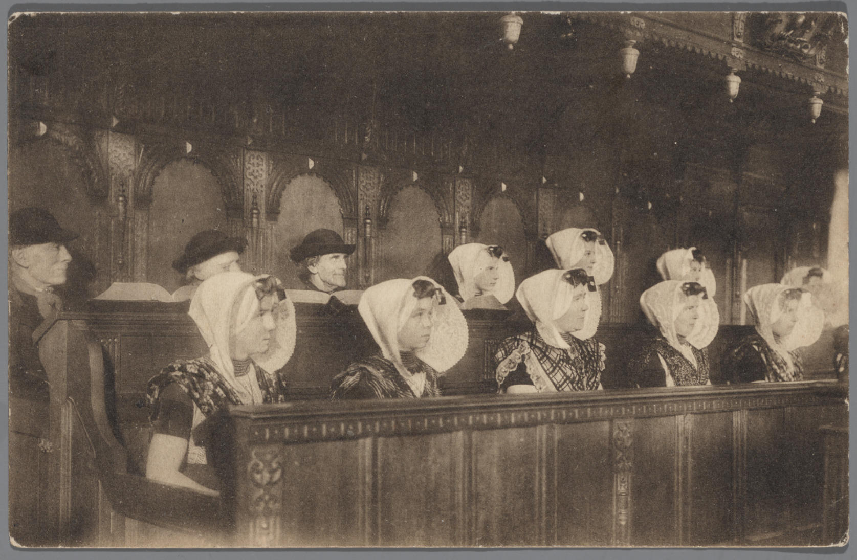 Kerkinterieur met mannen en vrouwen in protestantse ...