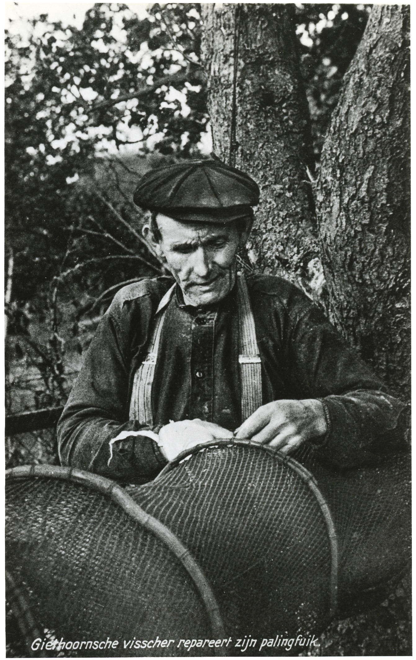 Visser in Giethoorn met een palingfuik, 1910–1935 (a...