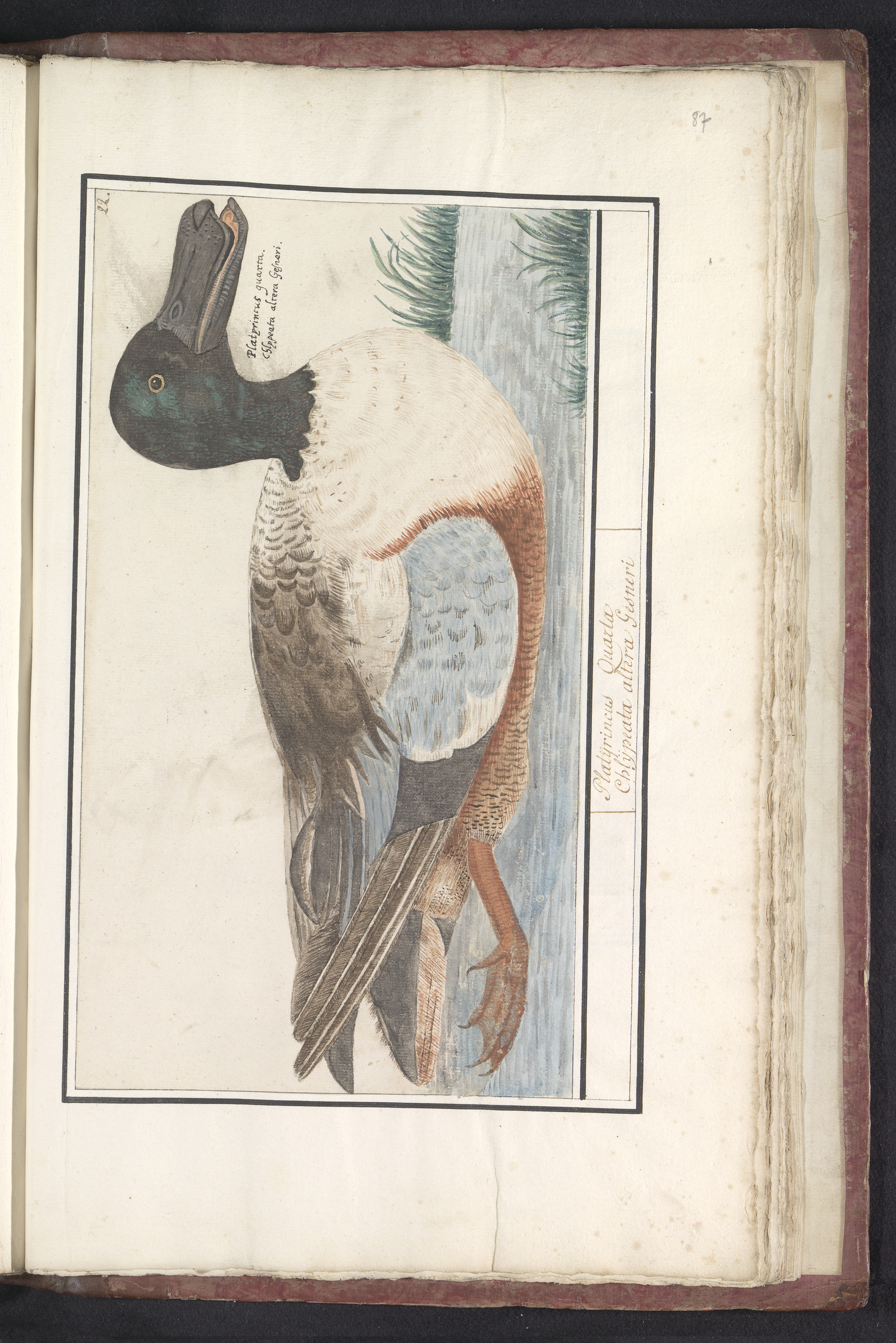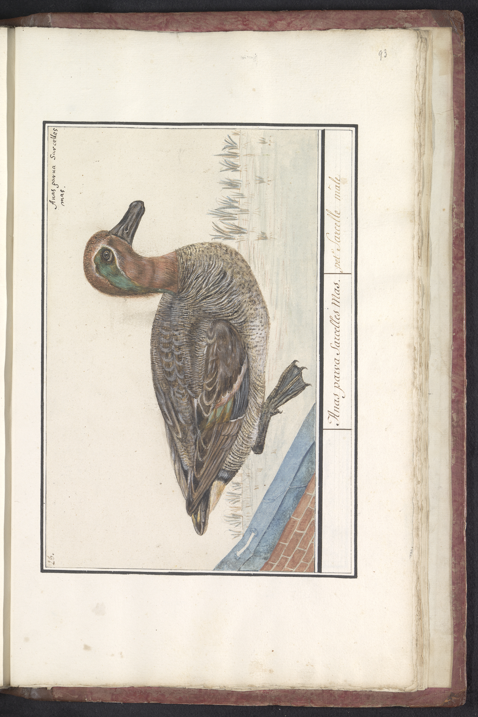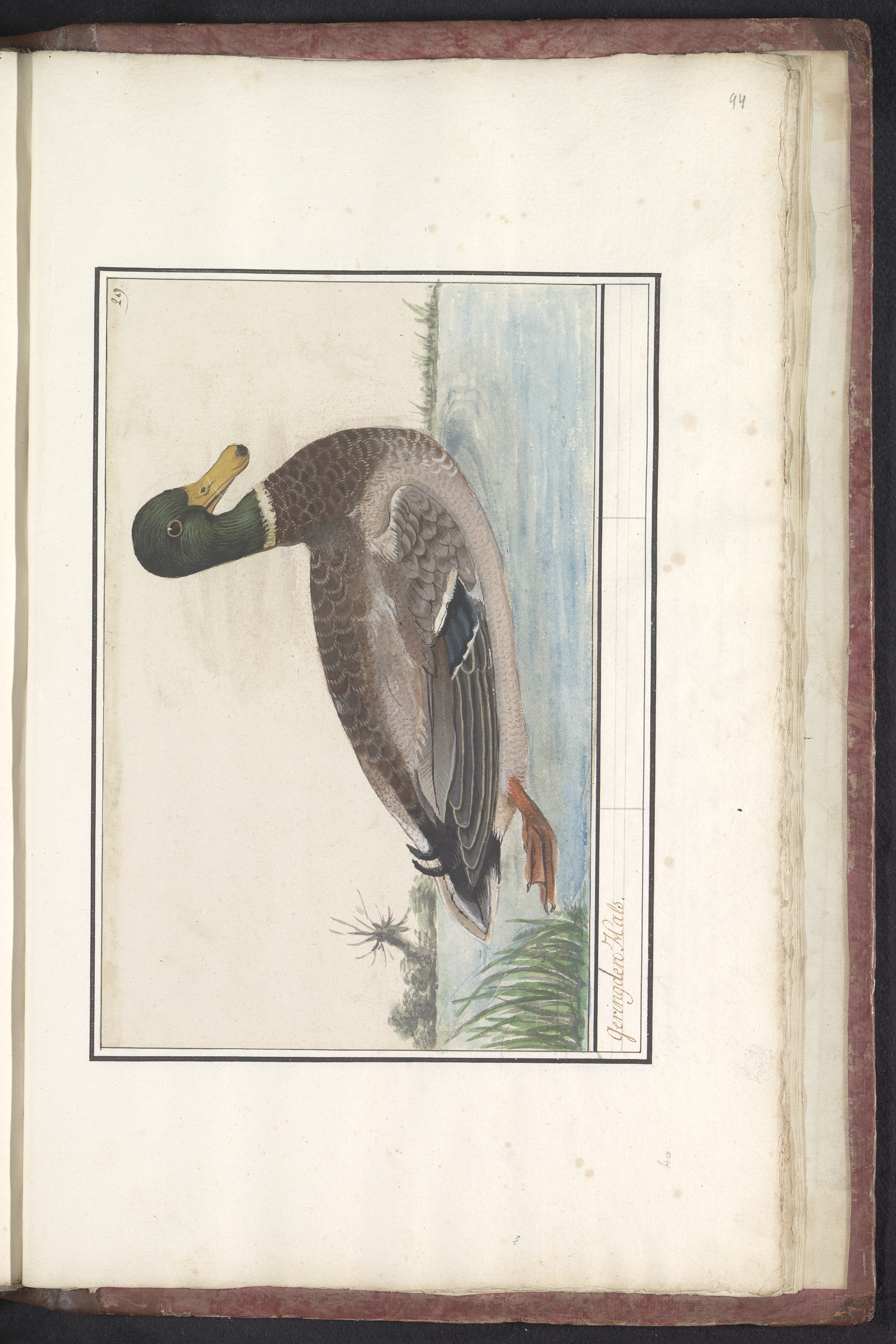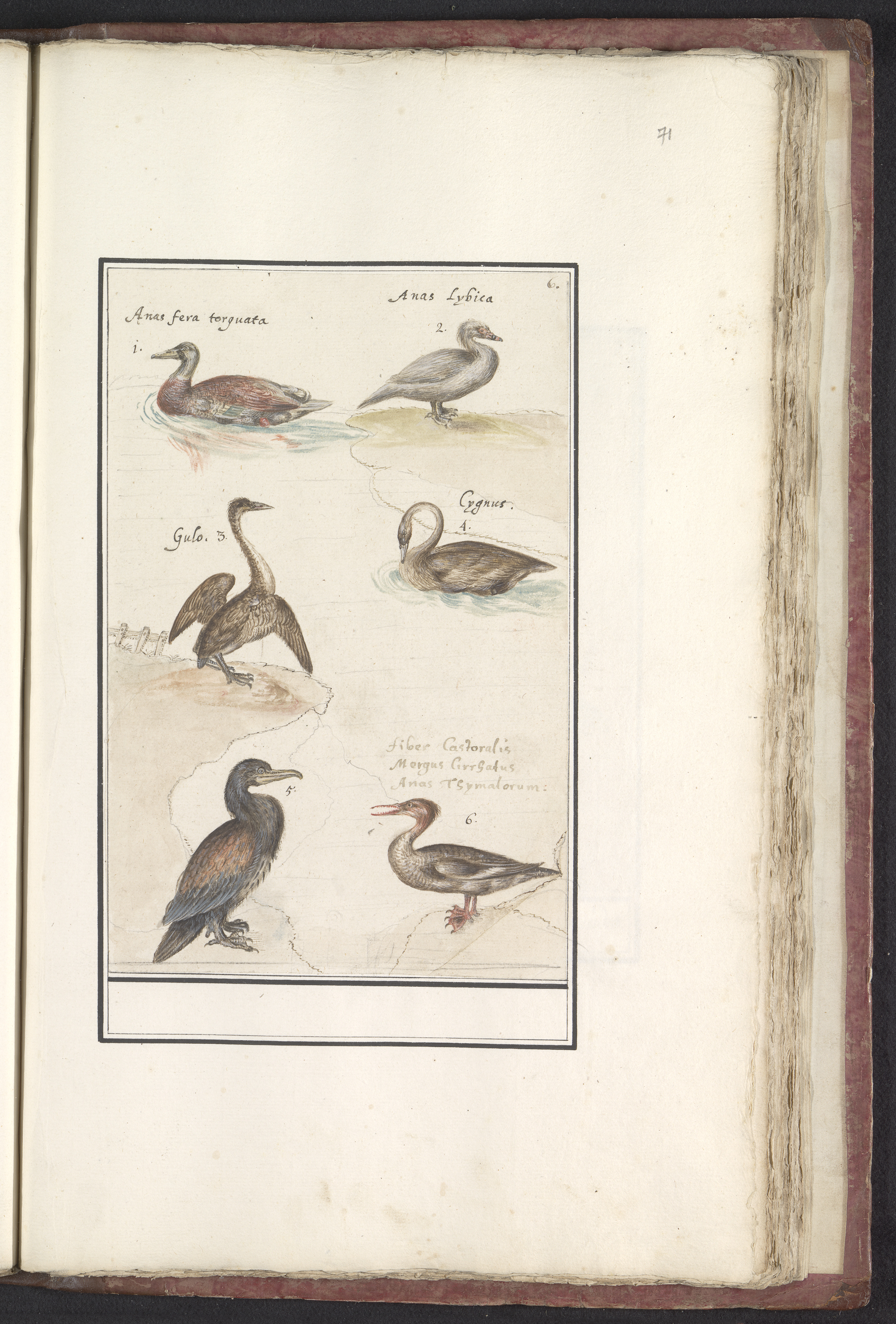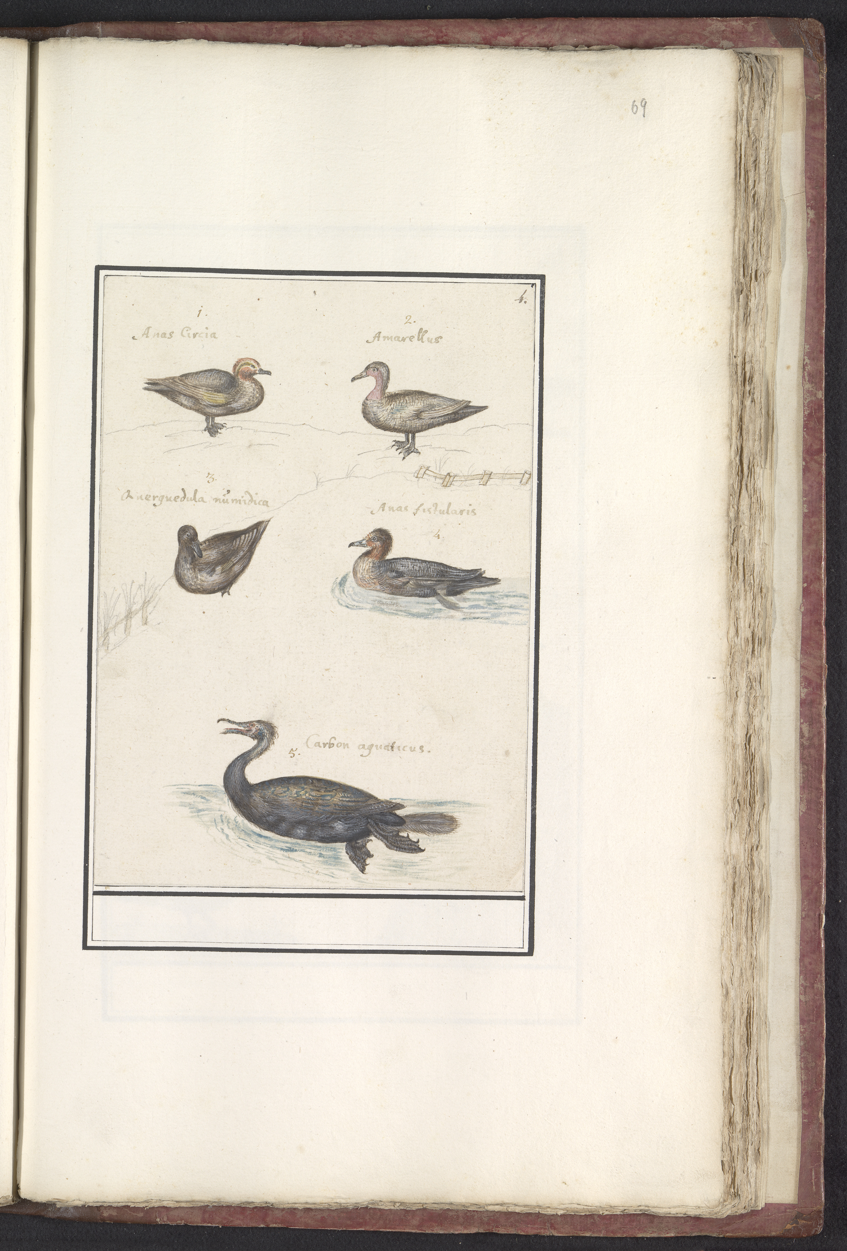 Blad met vier eenden (Anas) en een aalscholver (Phal...