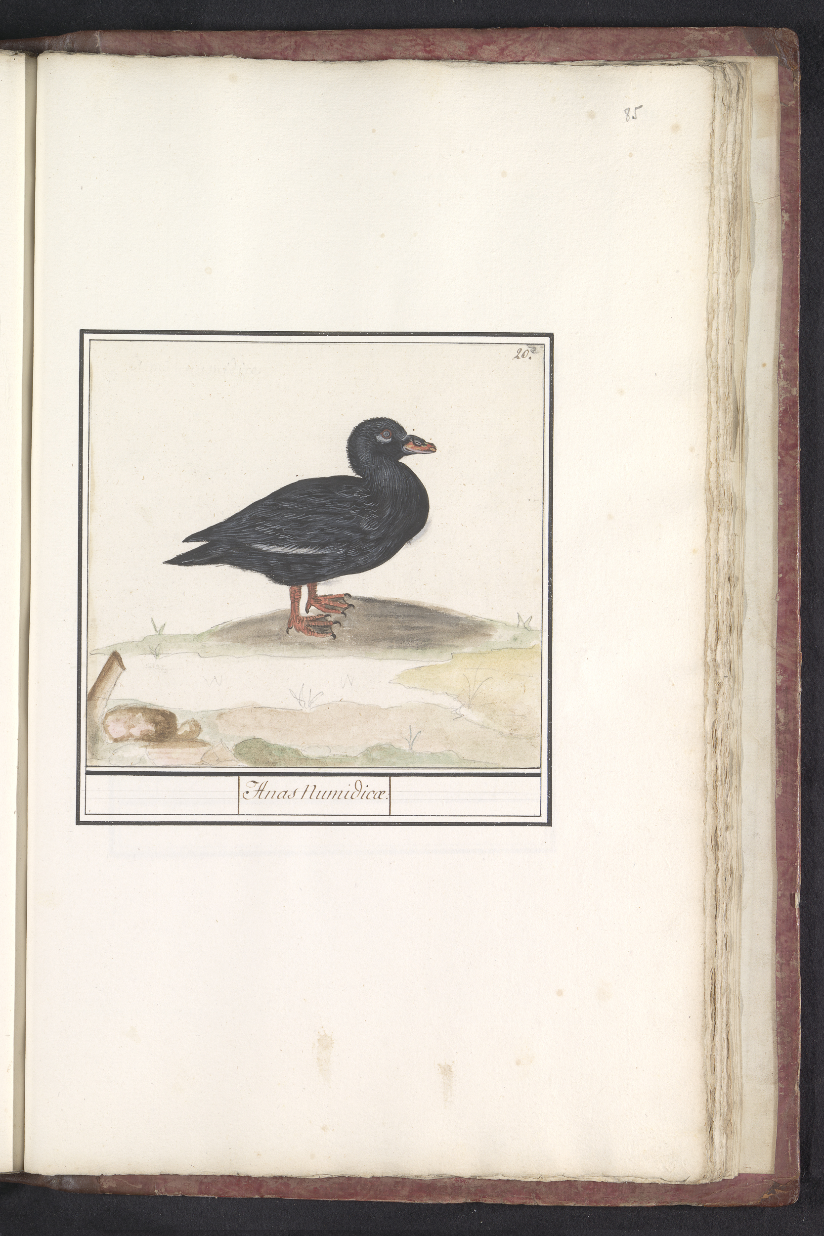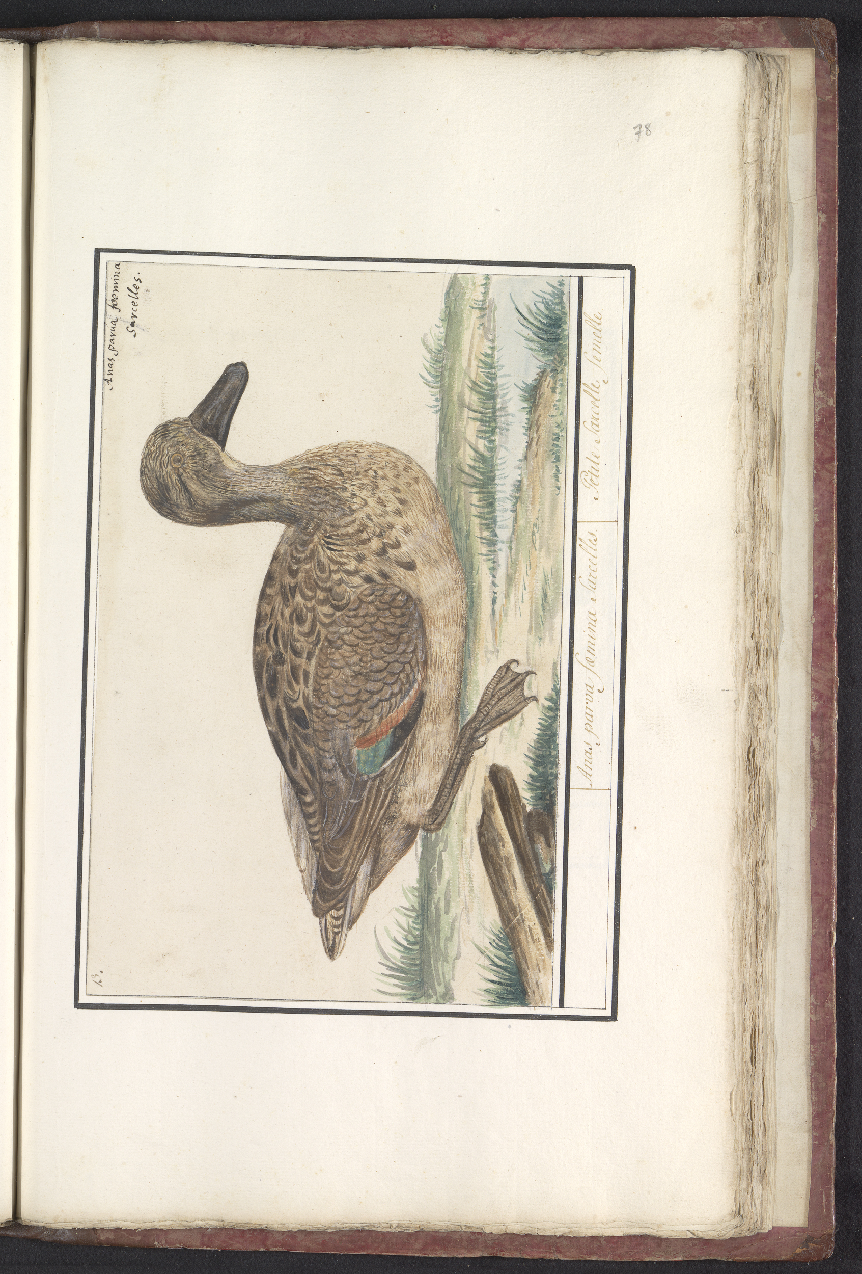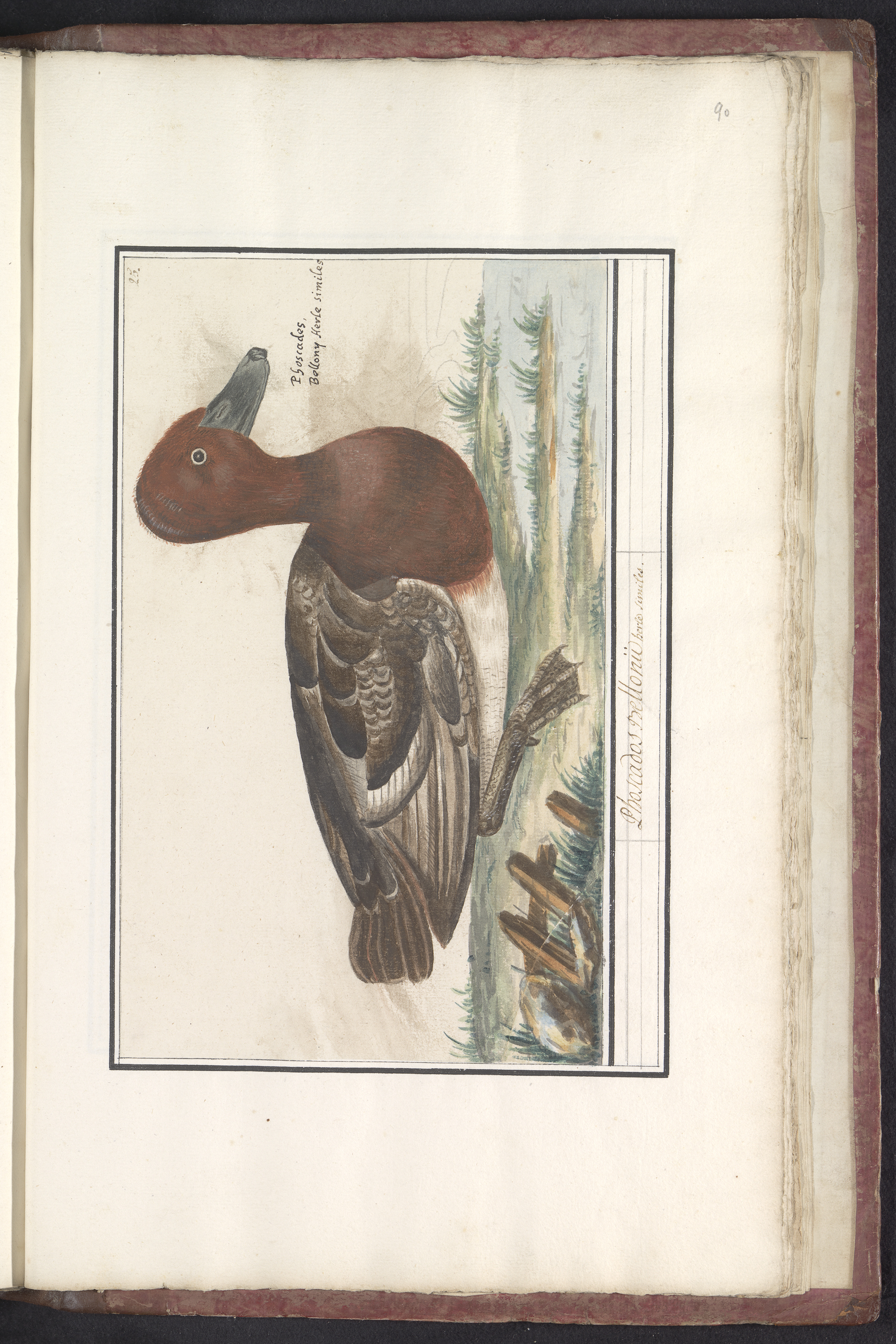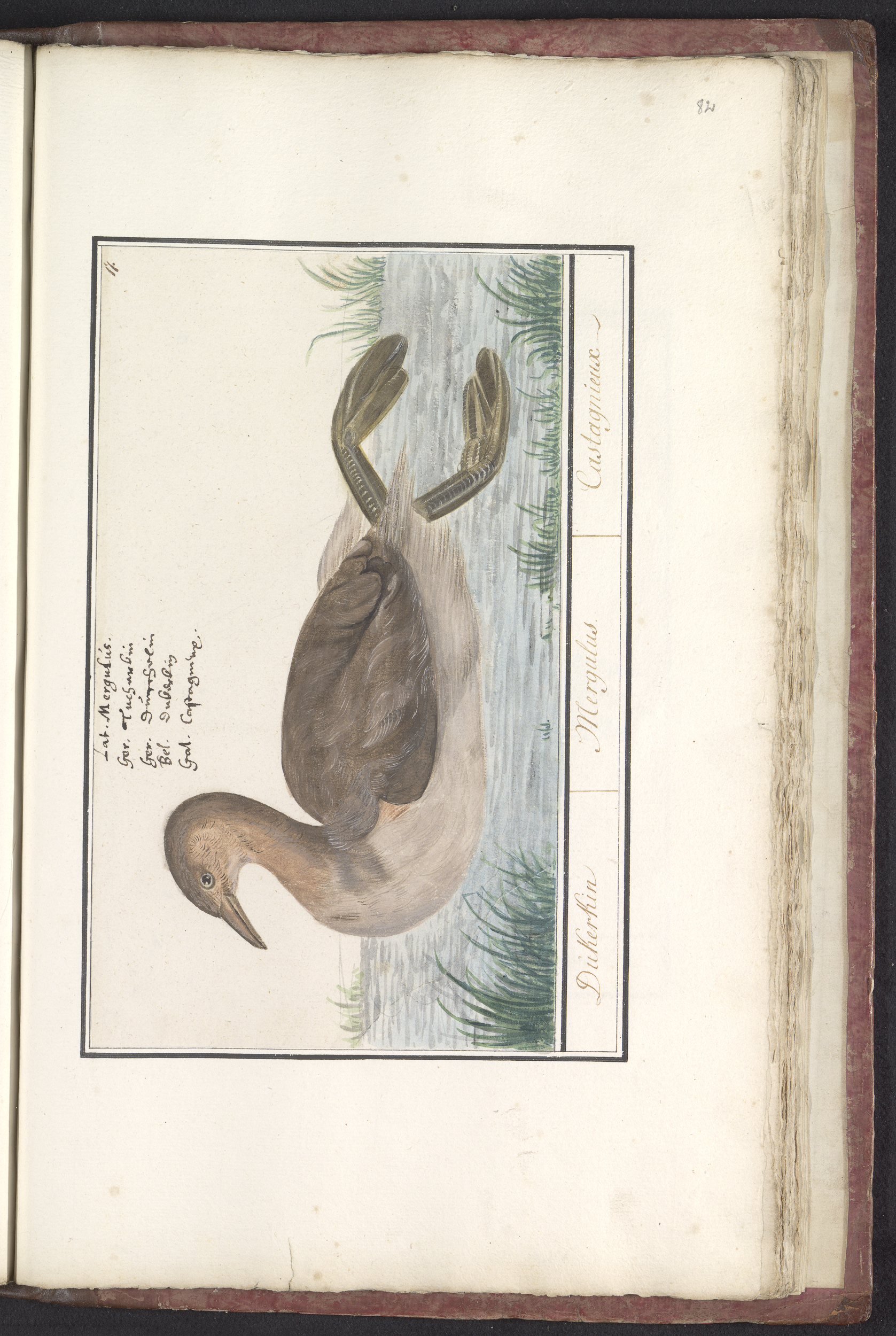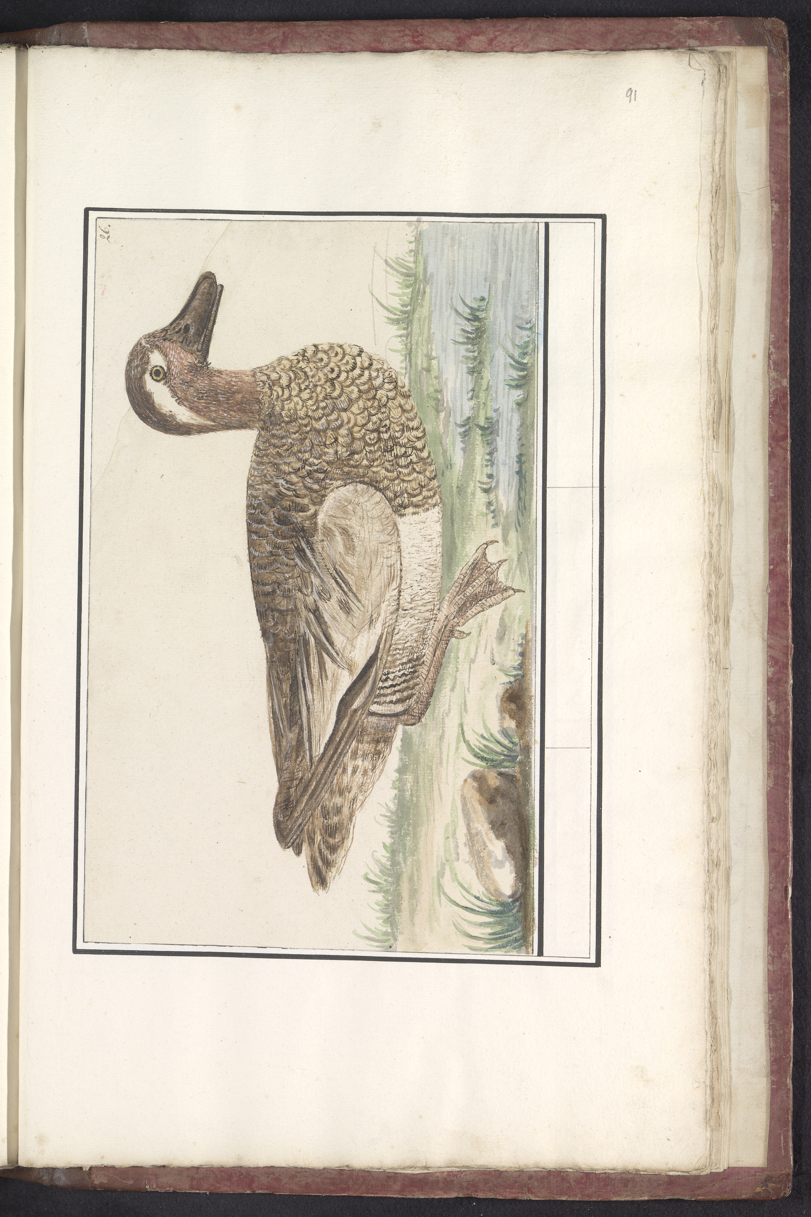 Blad met vier eenden (Anas) en een aalscholver (Phal...
