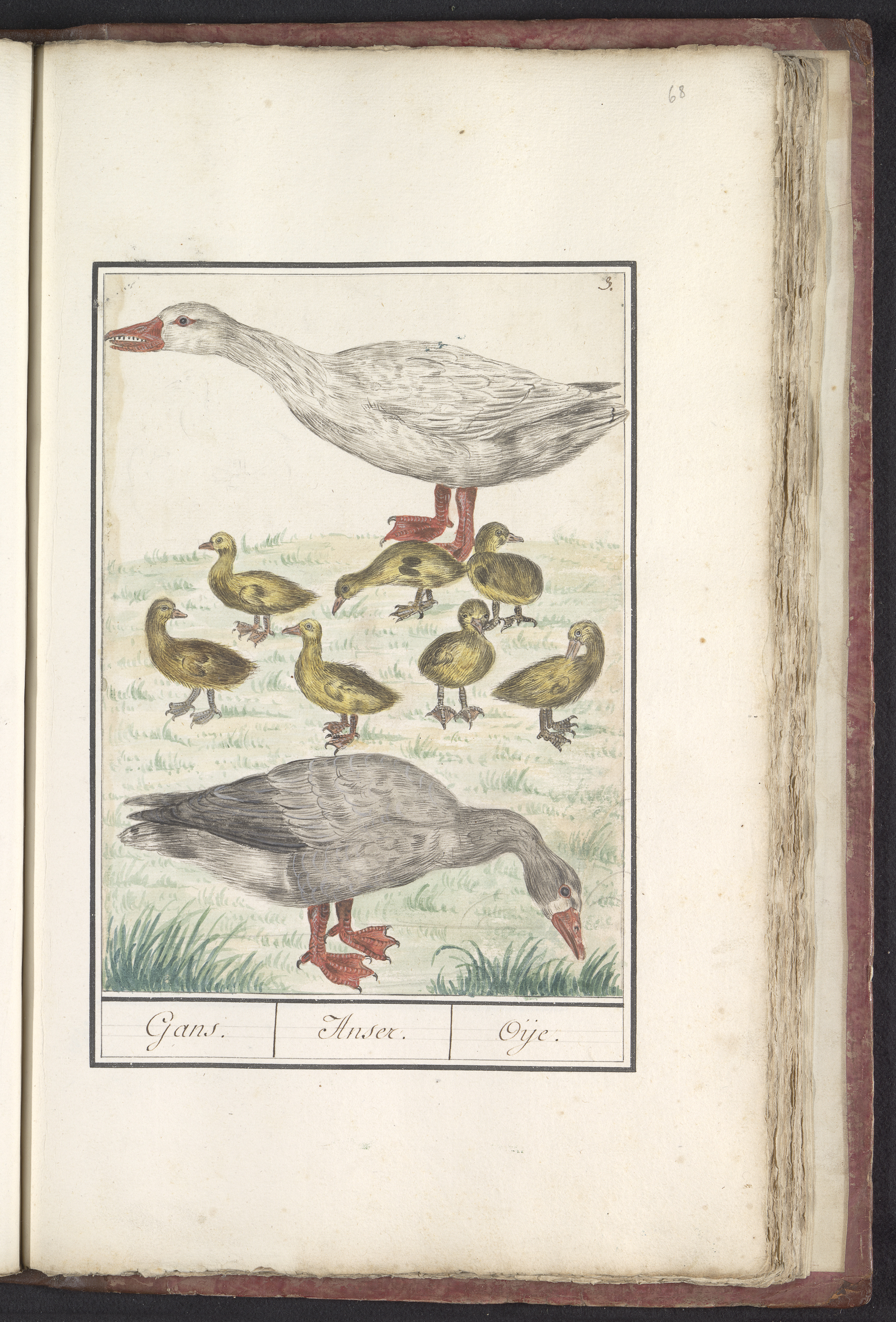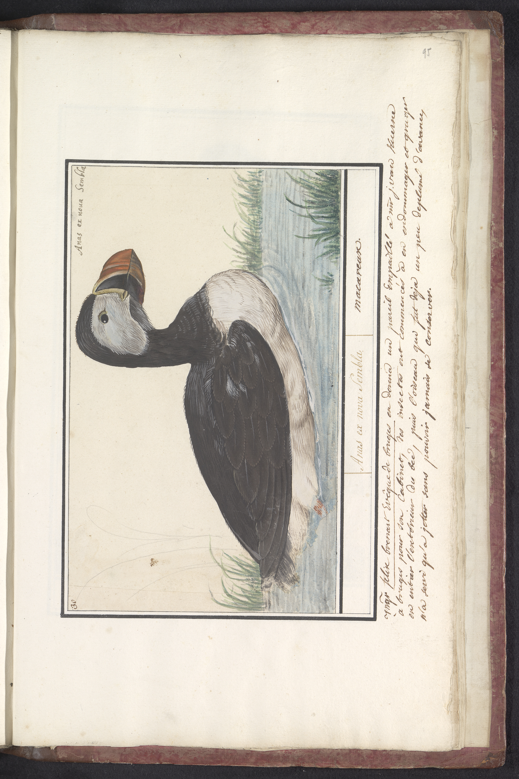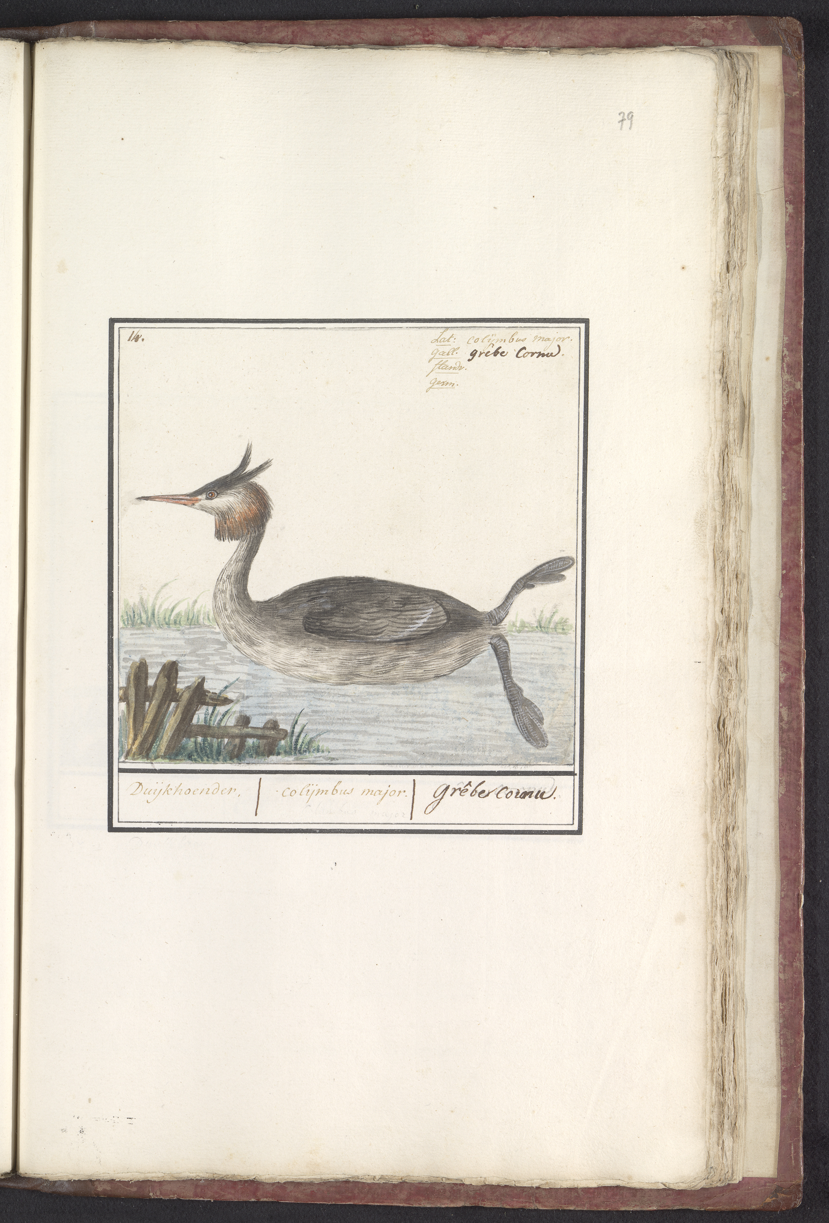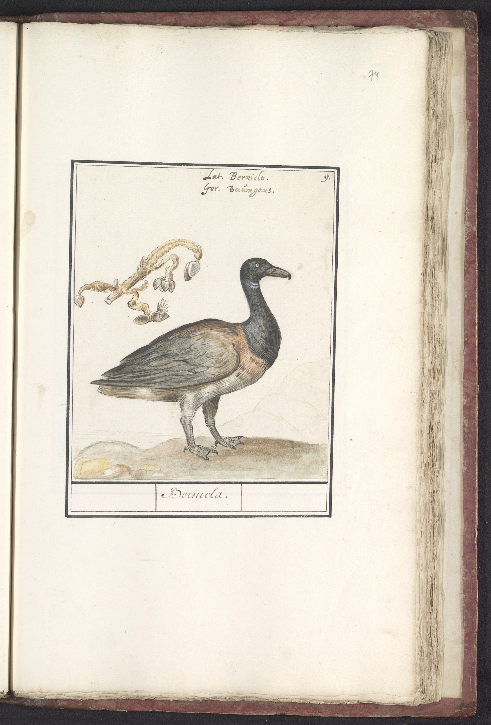 Blad met vier eenden (Anas) en een aalscholver (Phal...