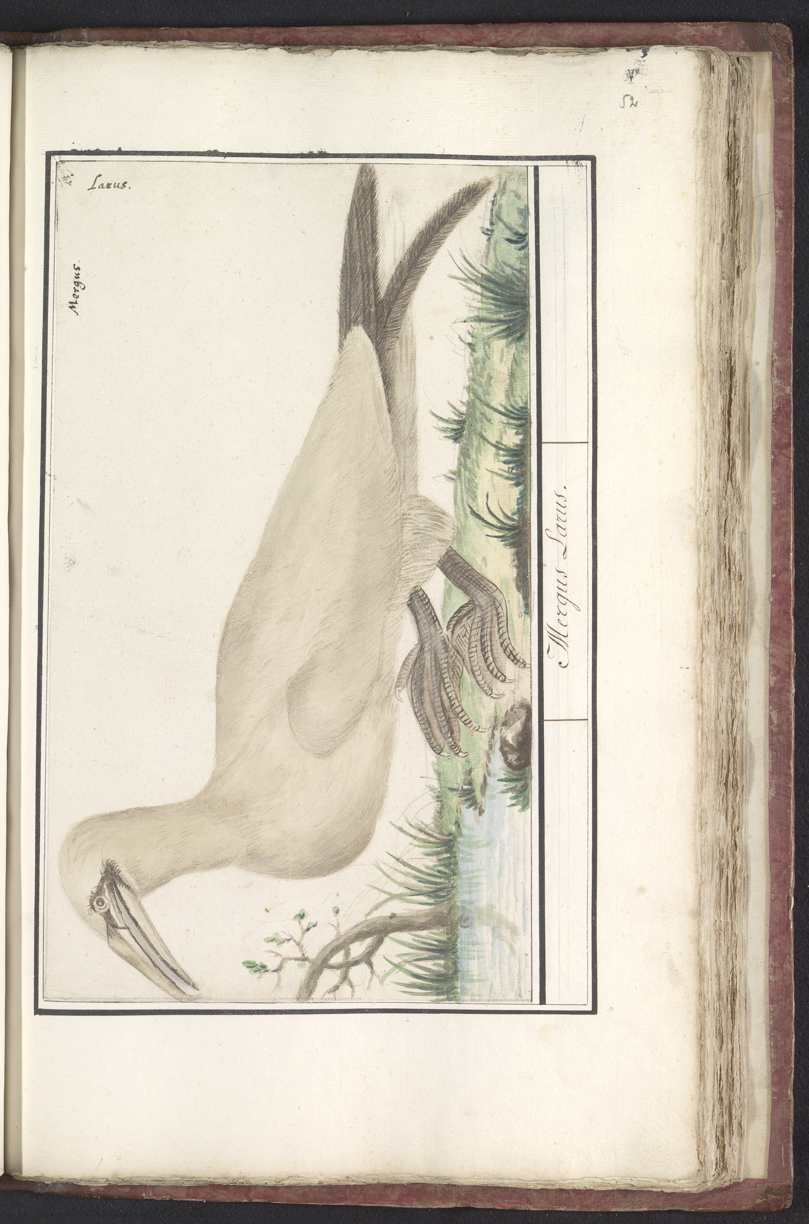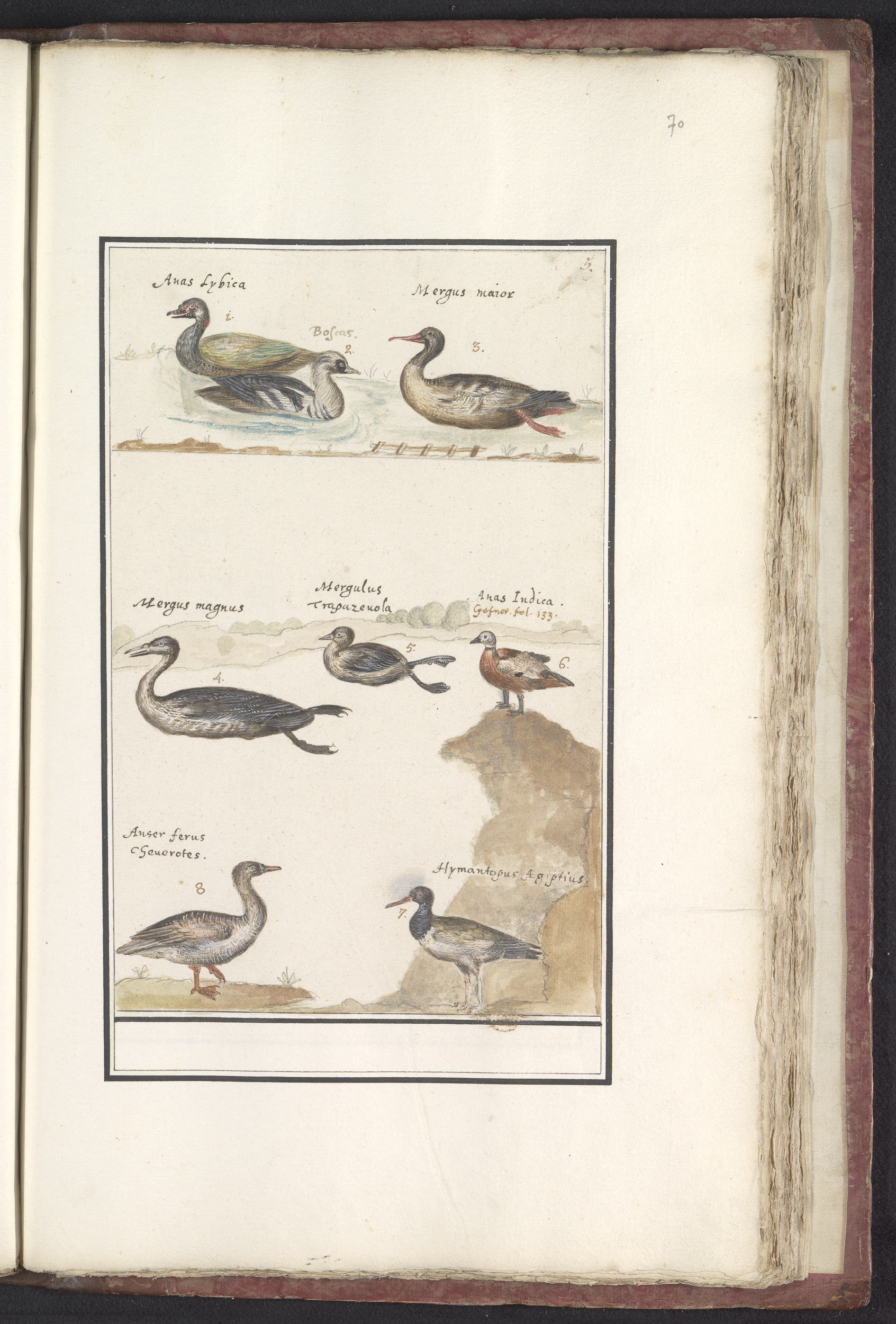 Blad met acht eenden (Anas), zaagbekken (Mergus) en ...