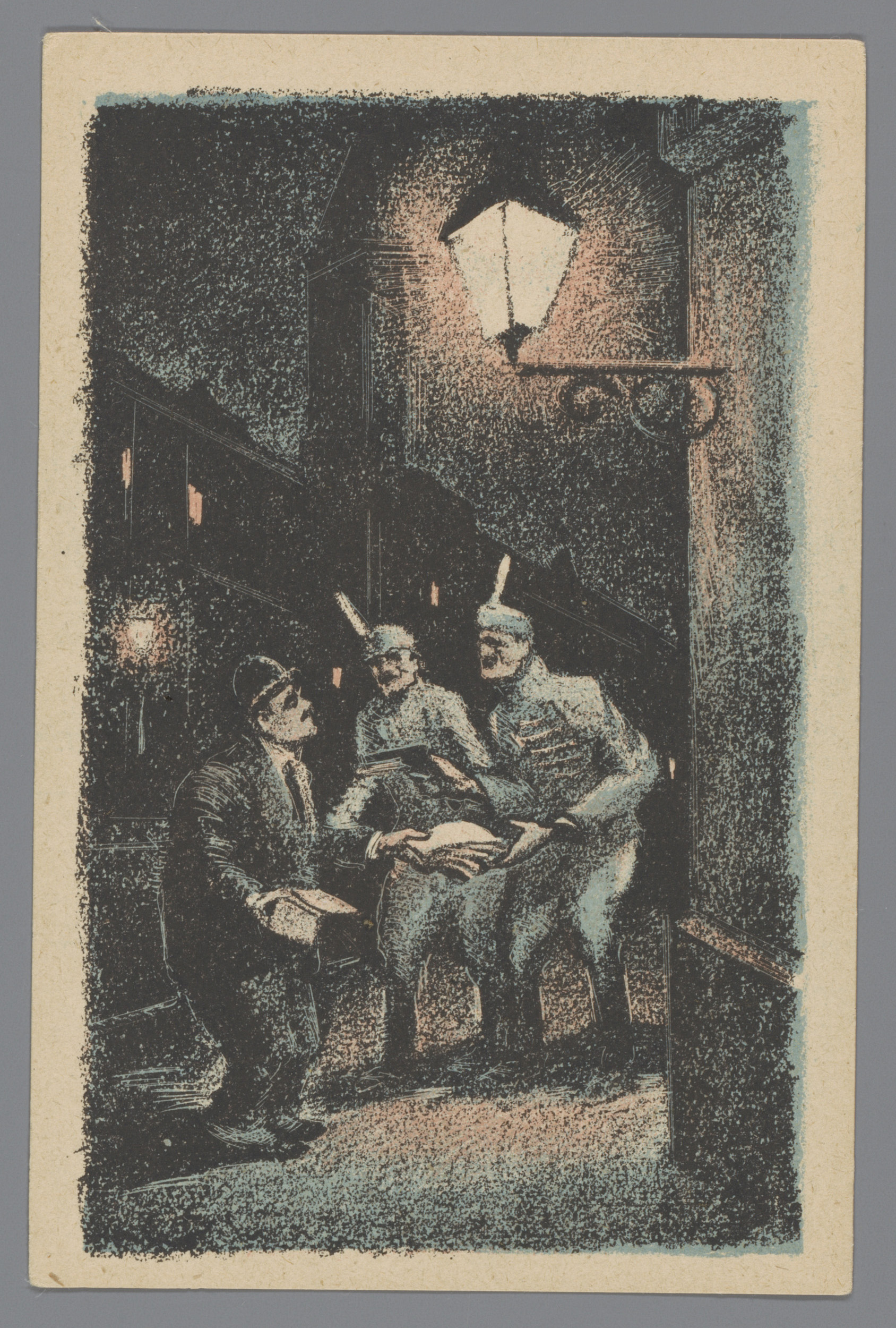 Man overhandigt geld aan twee soldaten onder een str...