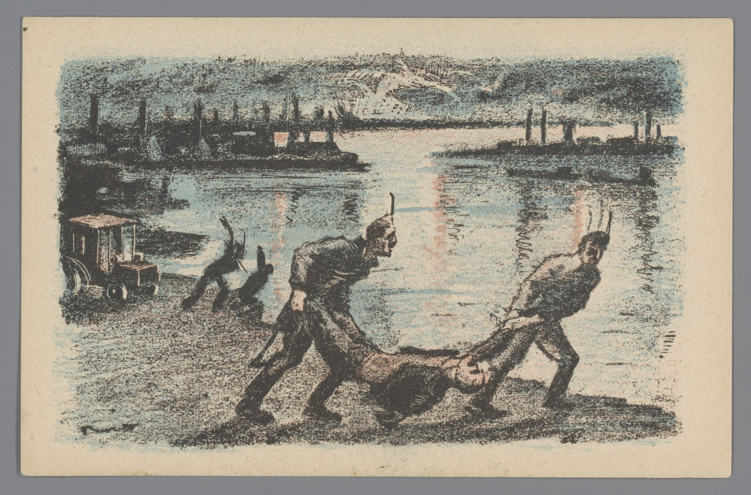 Soldaten gooien een man in de Donau