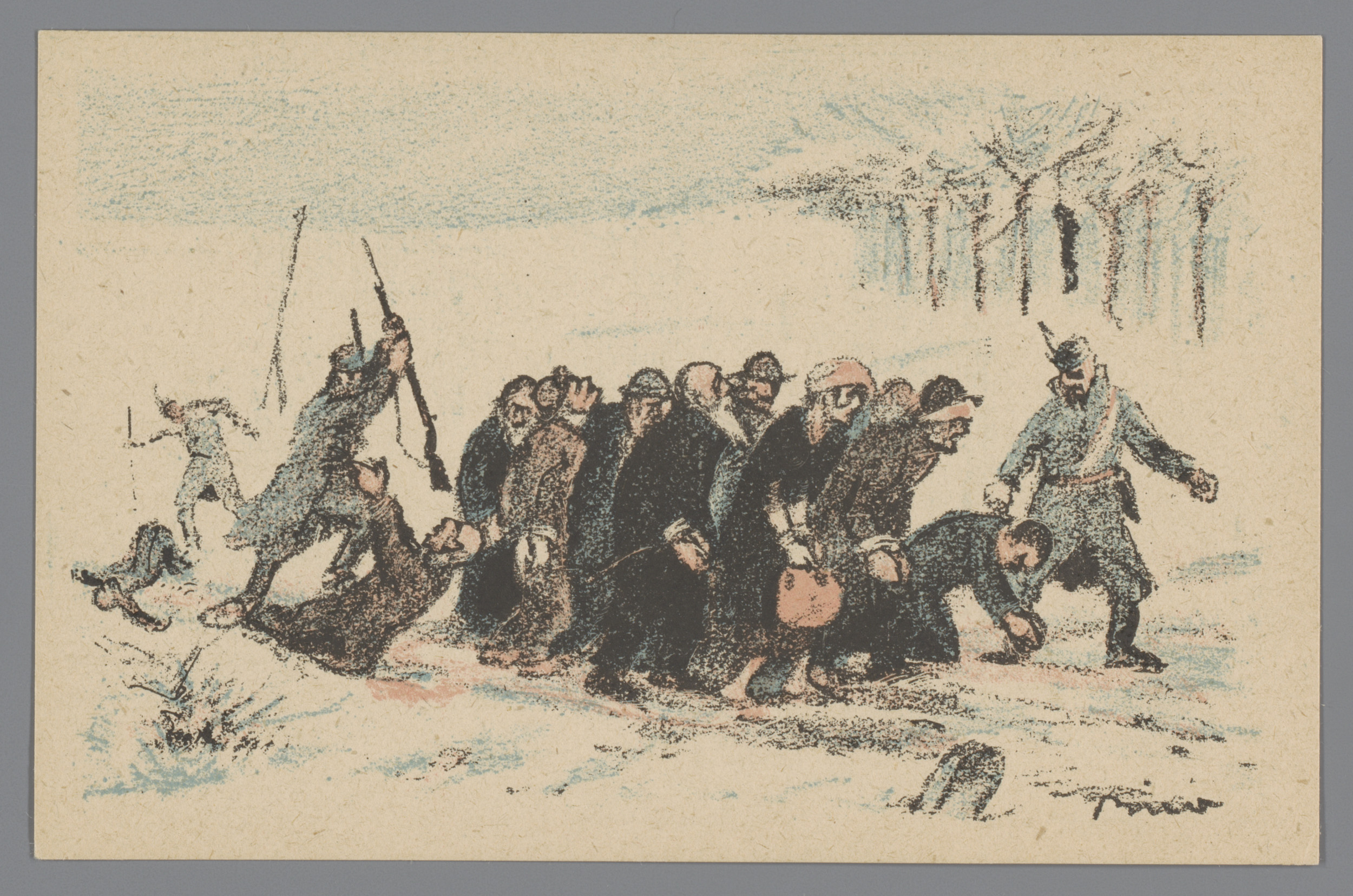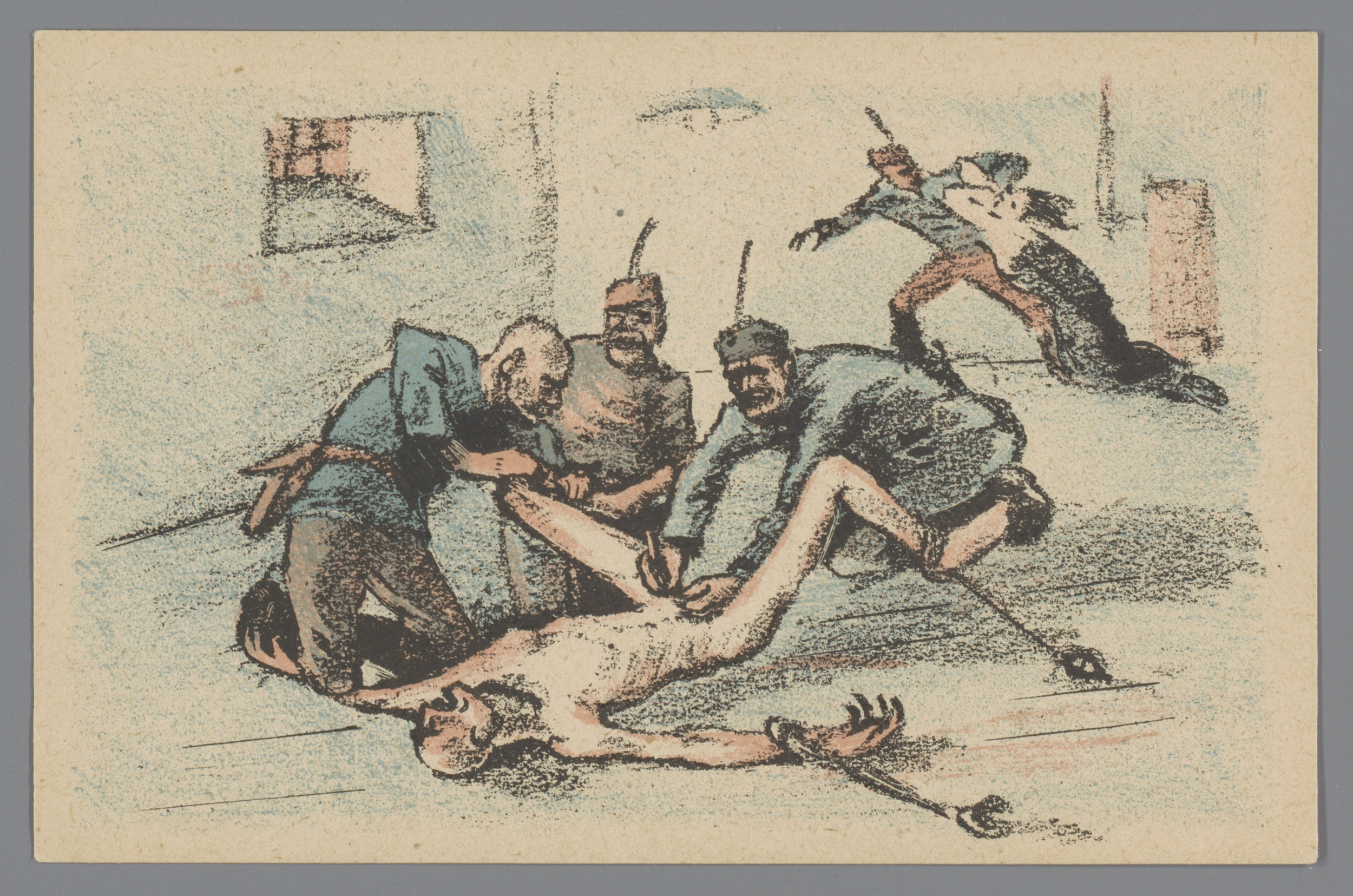 Naakte oude man aan een deur gespijkerd door soldate...
