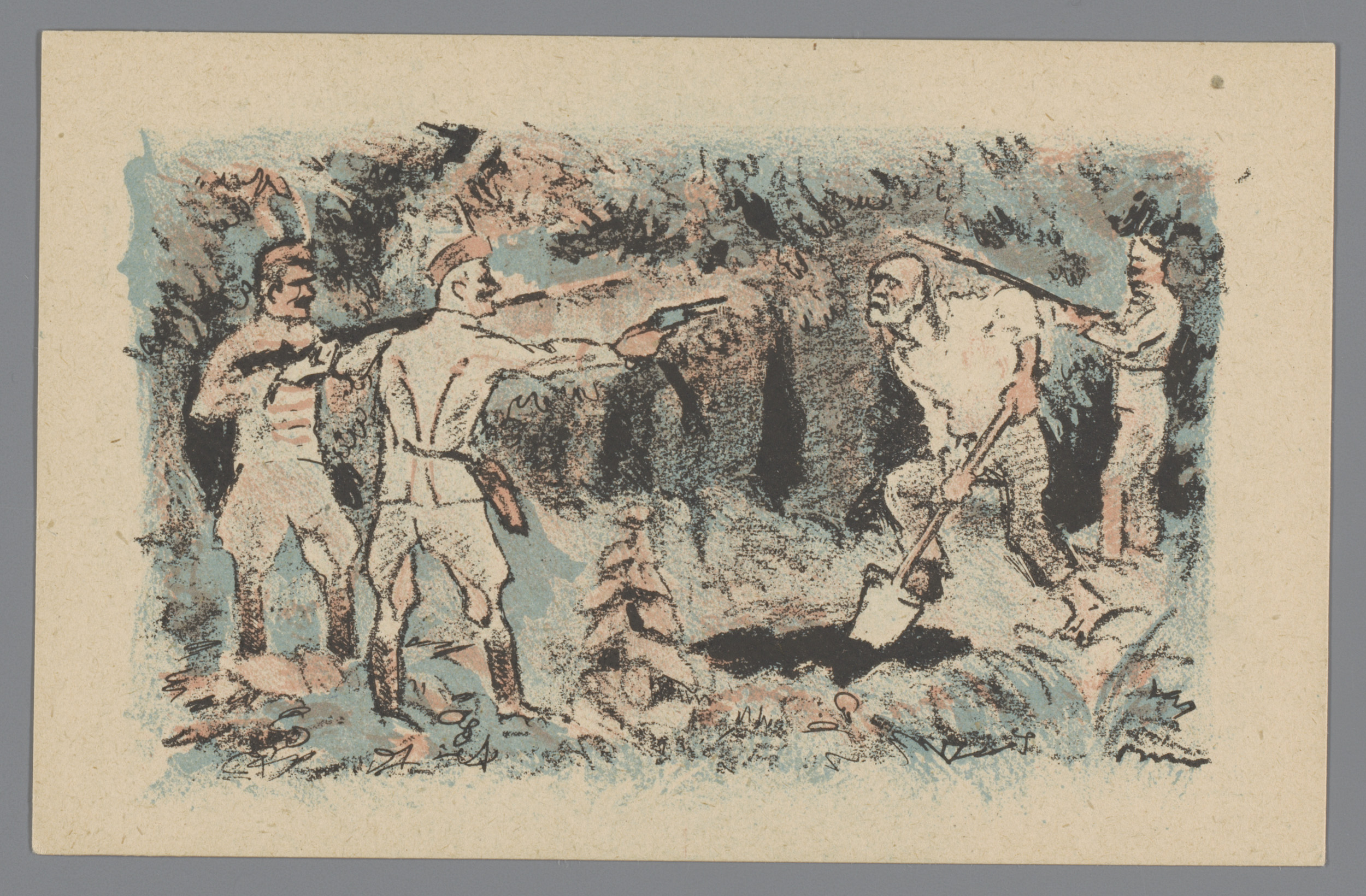 Soldaten houden een gravende man onder schot