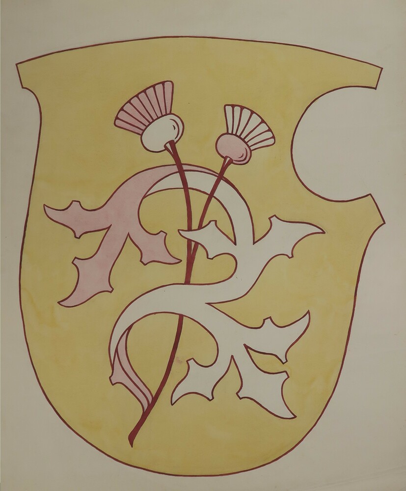 Schild in lichtgeel, rood en roze
