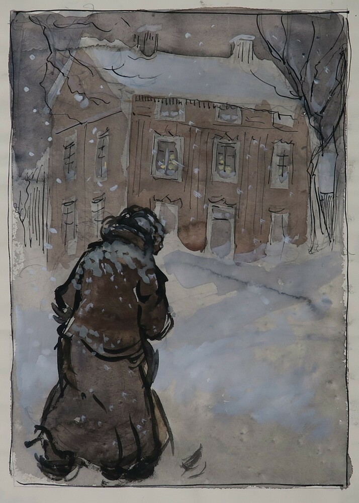 Man loopt in sneeuw voor rood huis, boek Gosta Berling.