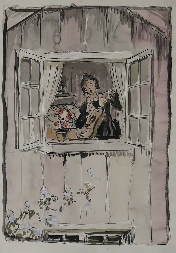 Zingende vrouw met gitaar voor openstaand raam