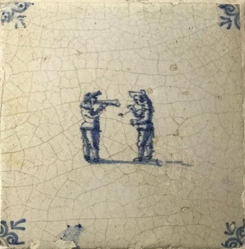 Tegel van aardewerk met tinglazuur voorstellende muz...