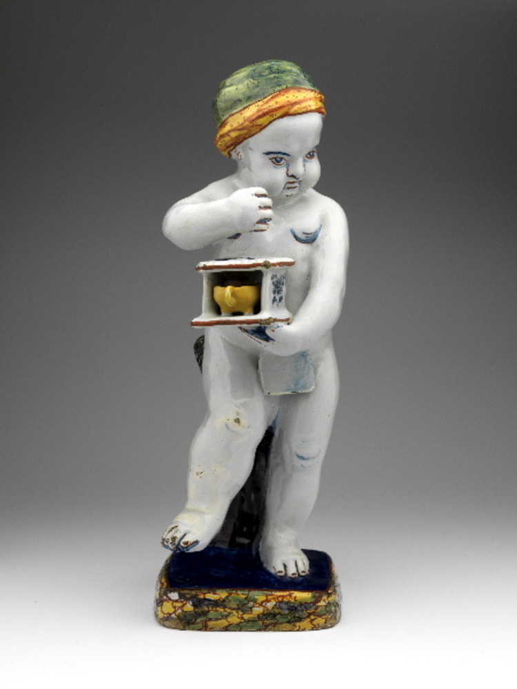 Beeldje van staande jongen, allegorie op de Winter.
