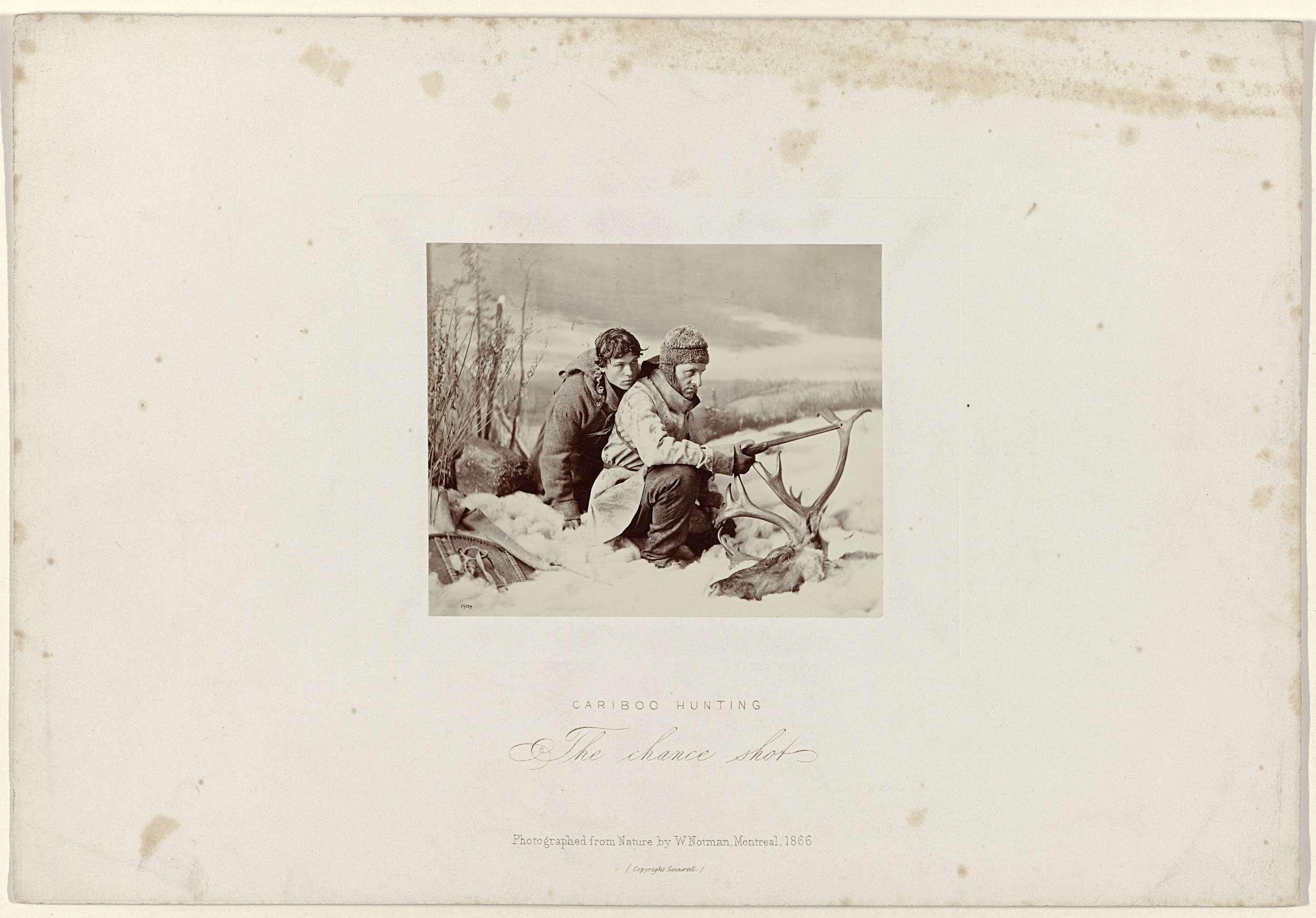 Twee jagers in de sneeuw met de kop van een eland
