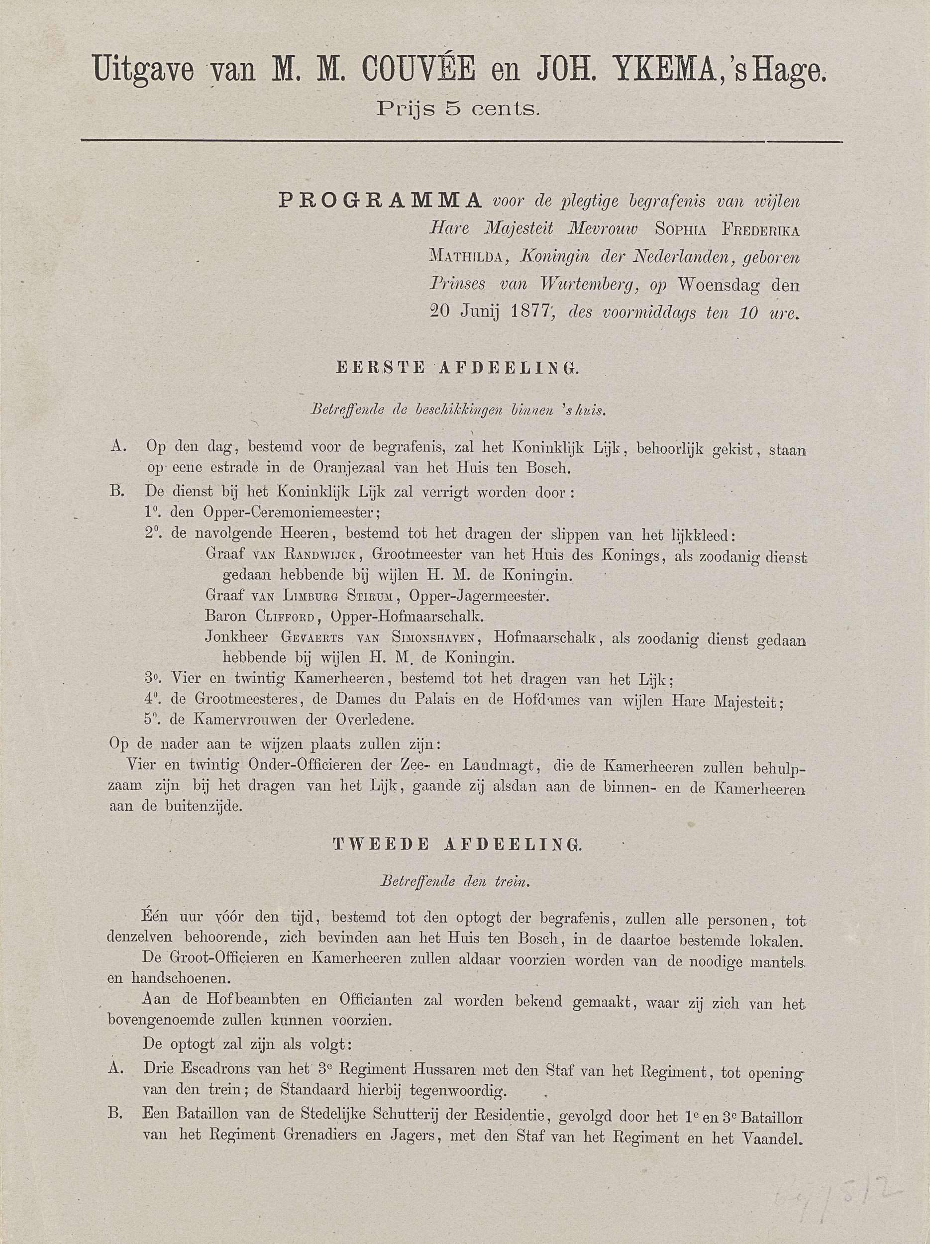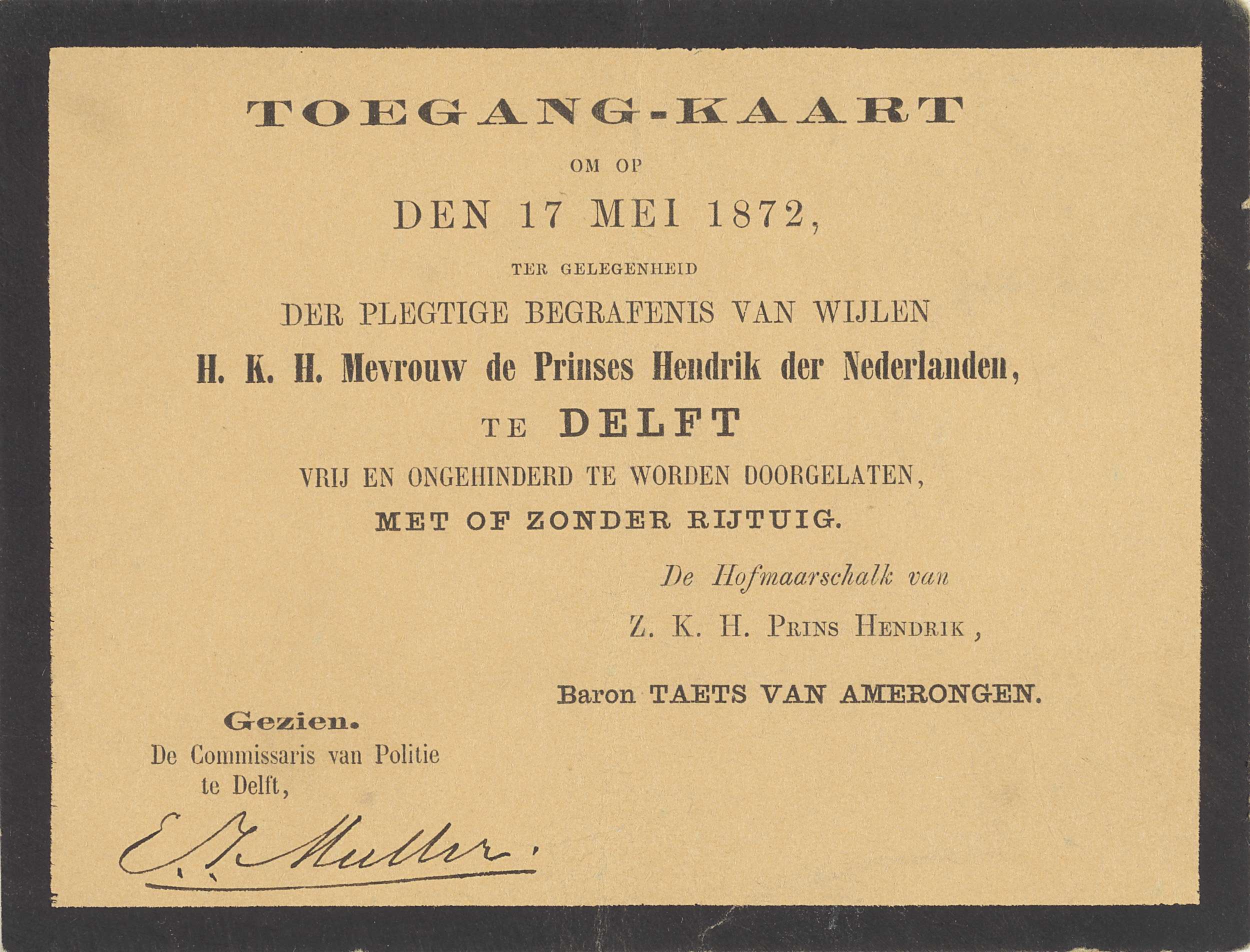Toegangskaart voor de begrafenis van prinses Amalia ...