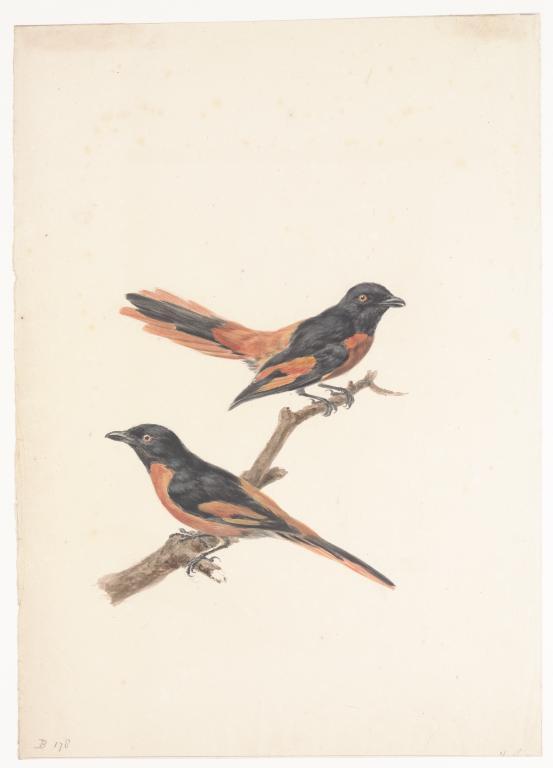 Scharlaken menievogels op tak