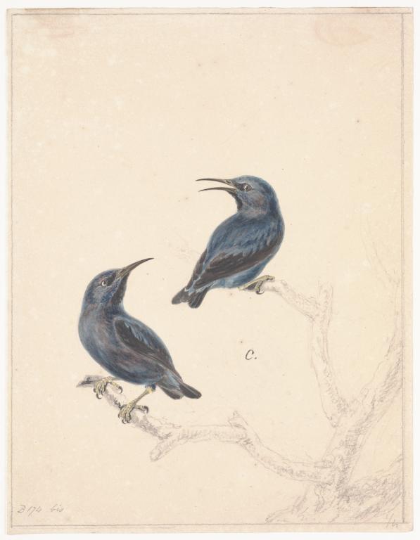 Twee purperen suikervogels op tak