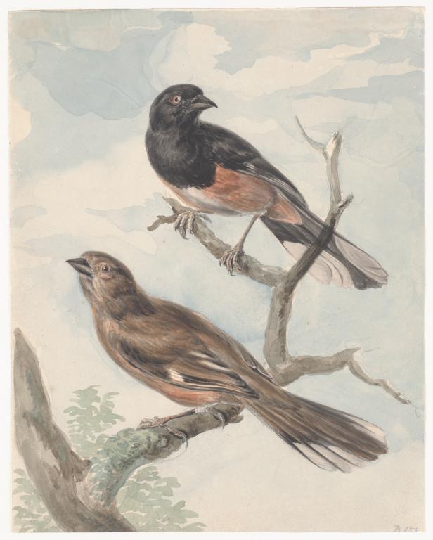 Staalborsthoningzuiger en roodkophoningvogel op tak