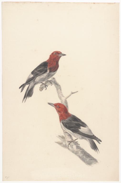 Koppel roodkopspechten op tak