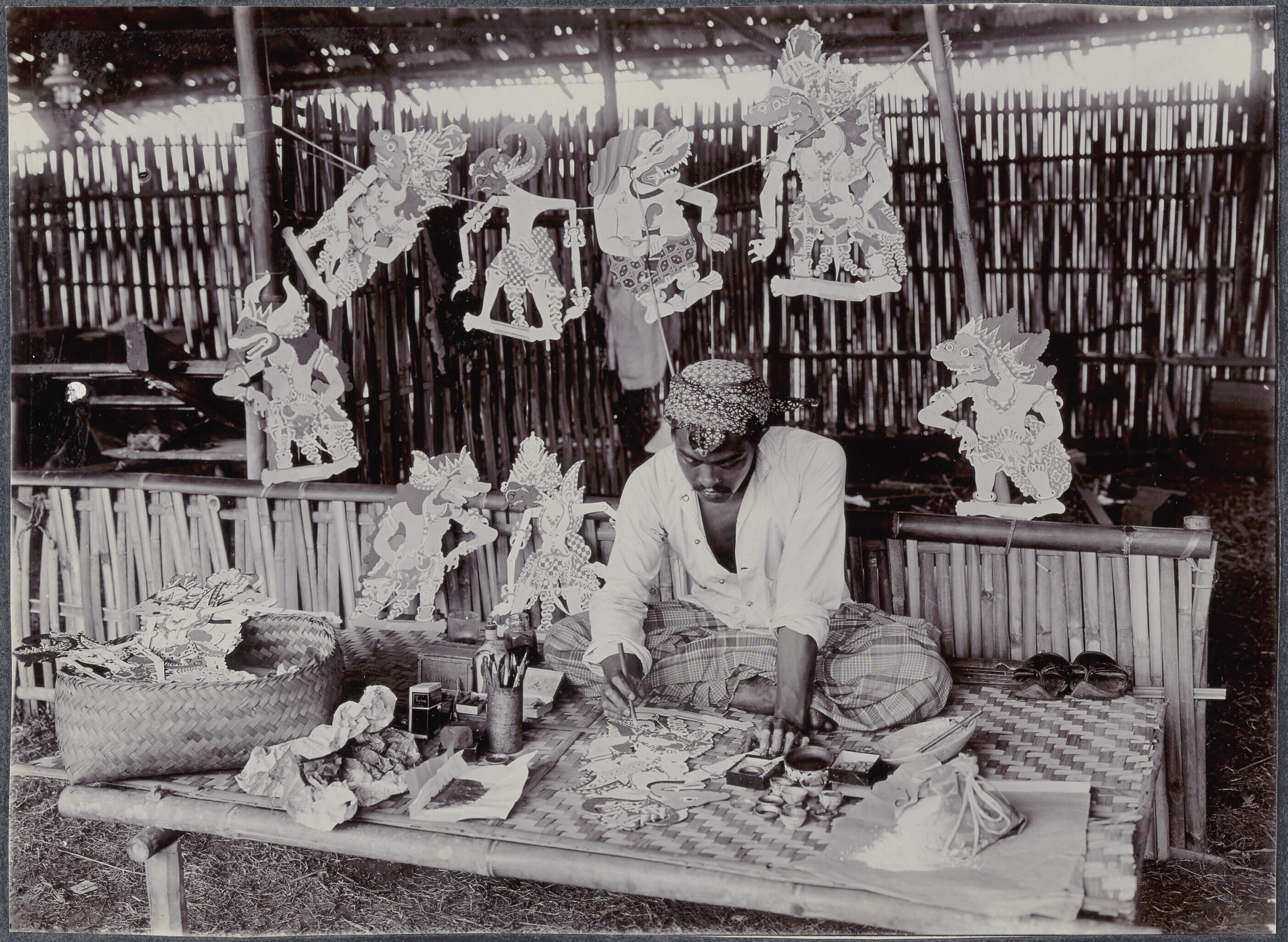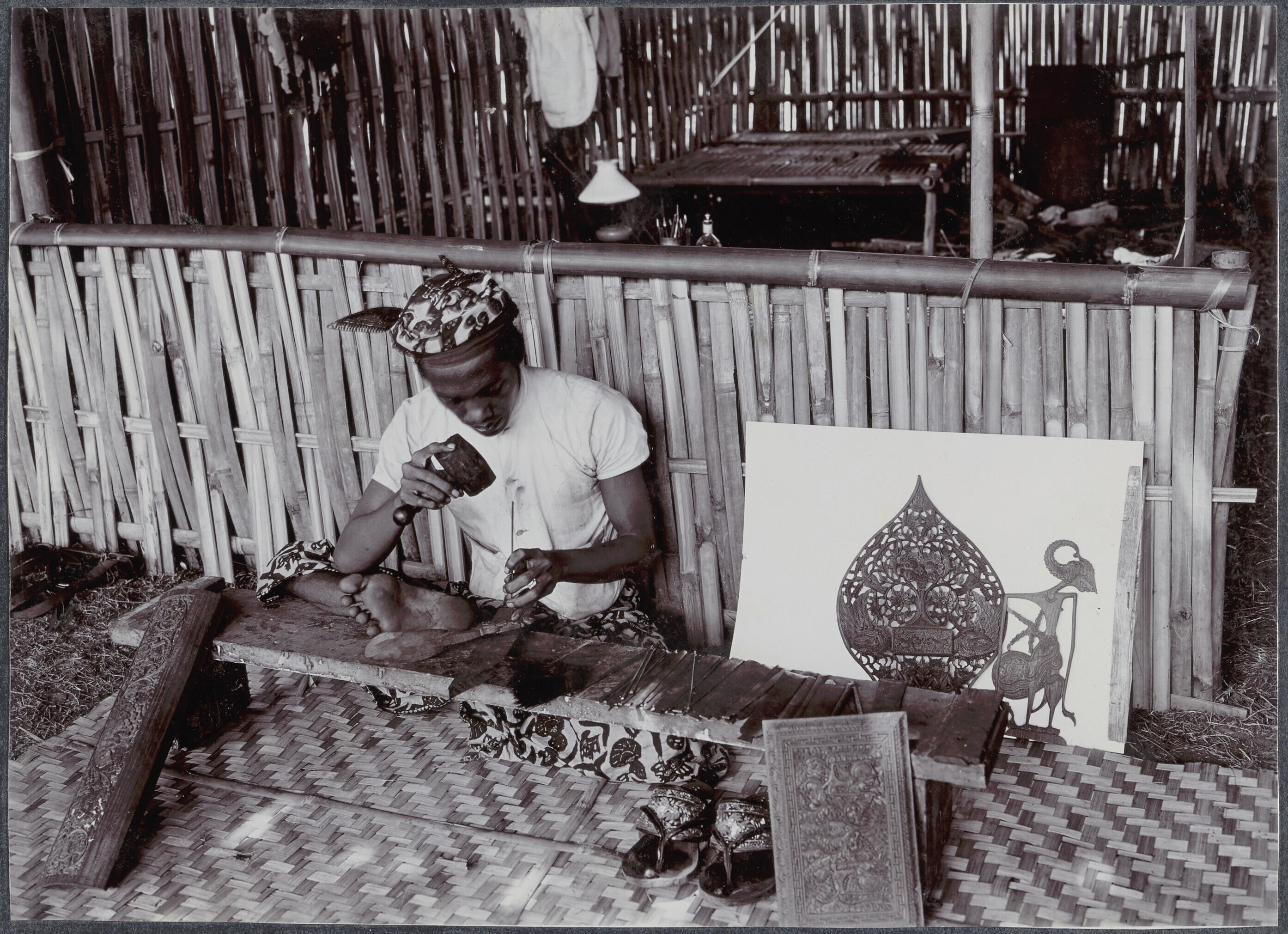 Een maker van wajang kulit poppen aan het werk