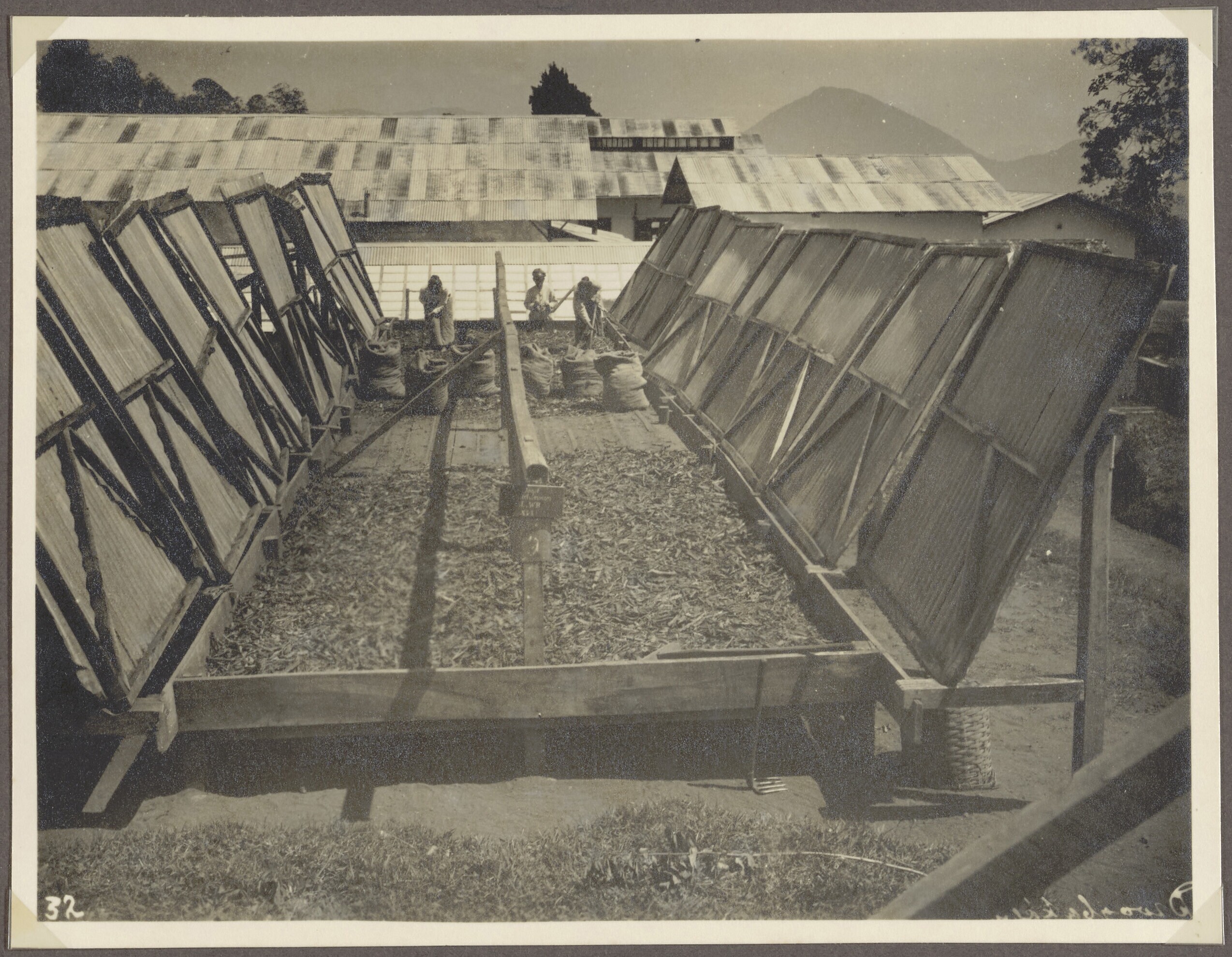 Droogbak met geoogste kinabast op plantage Tjinjiroean