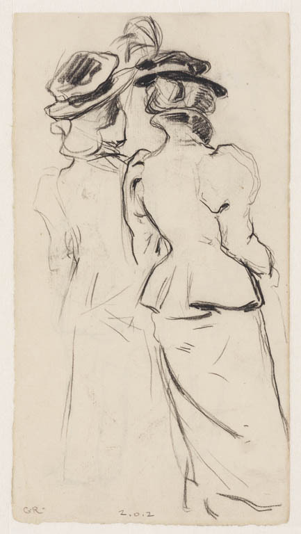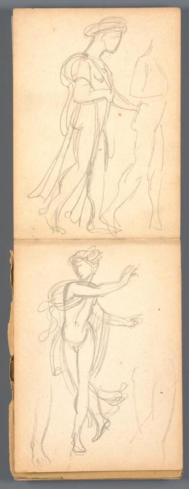 Drie schetsen van Maria, op de rug gezien.