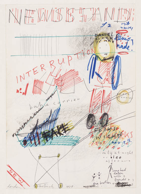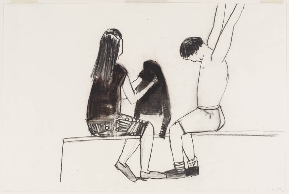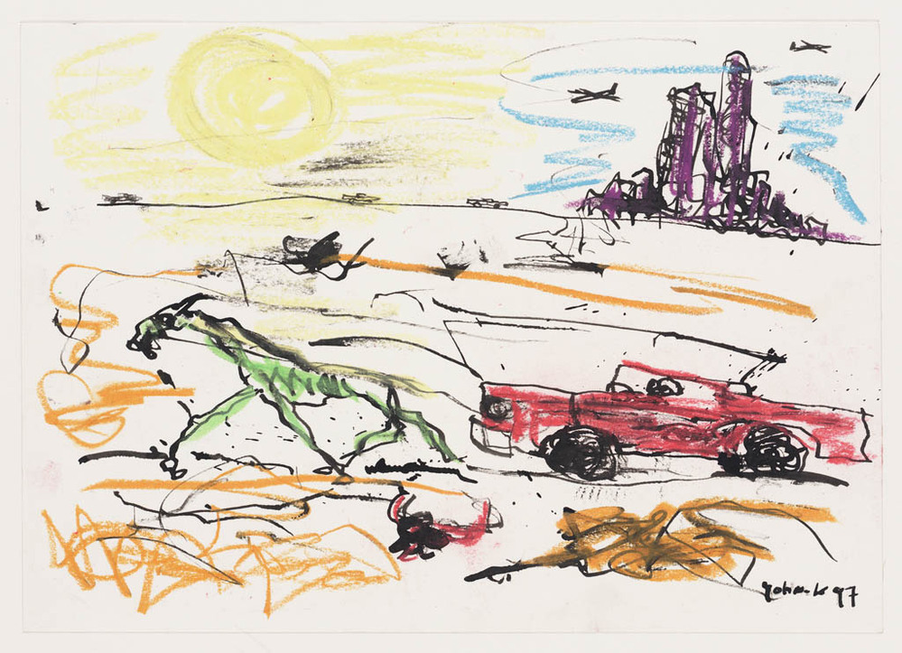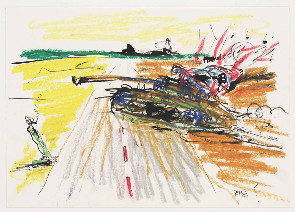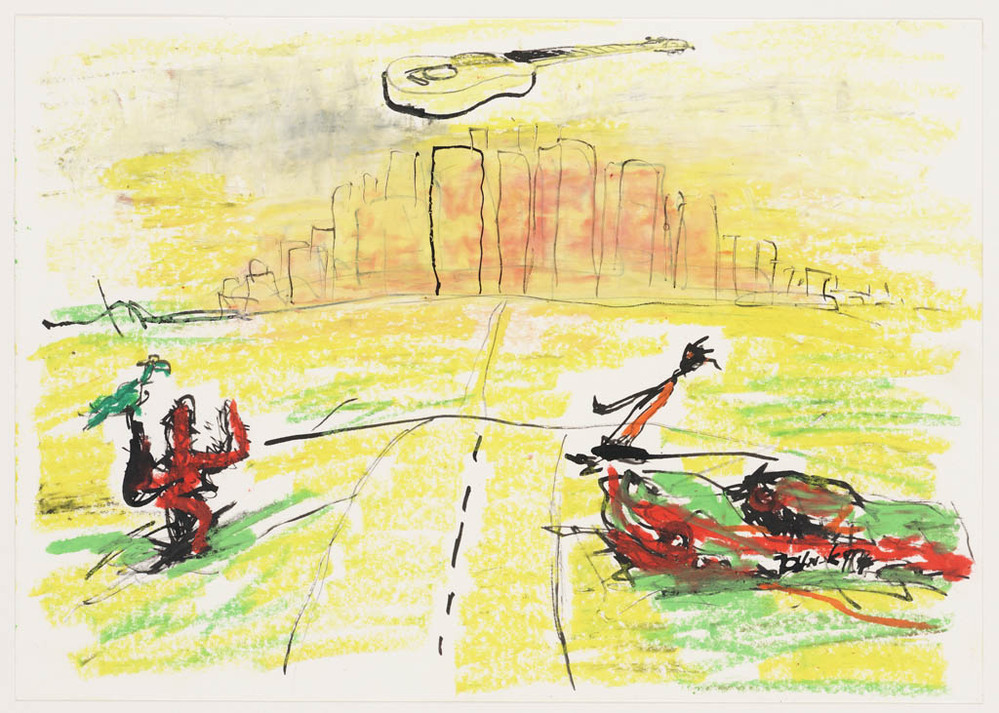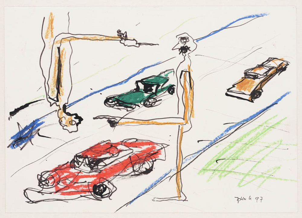 Zonder titel / Twee figuren bij een straat met auto's