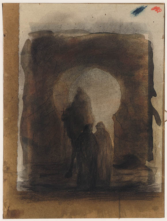 Kameel met berijder en twee figuren in gewaden bij e...