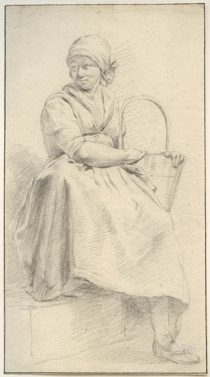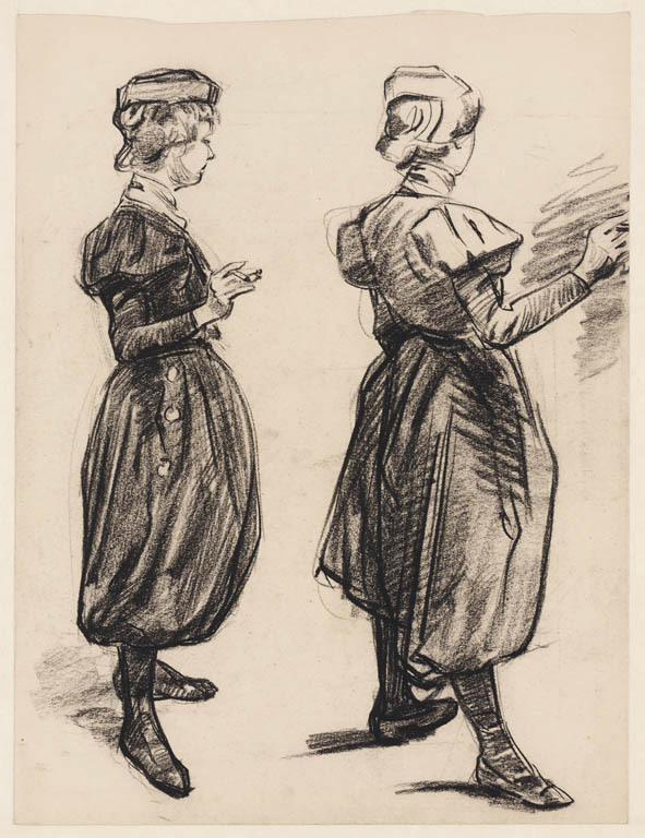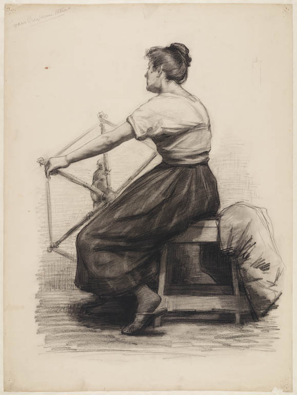 Modelstudie van vrouw, zittend aan een spinnewiel