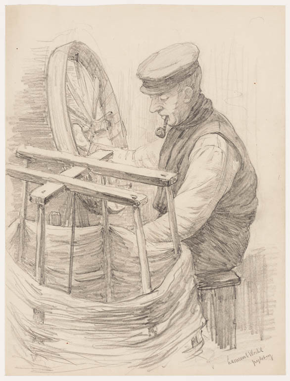 Larense boer, vlas spinnend