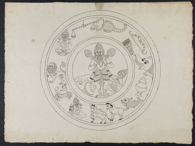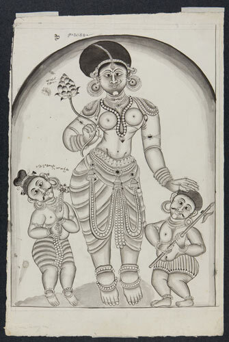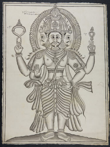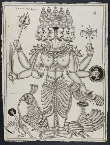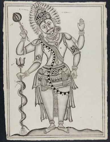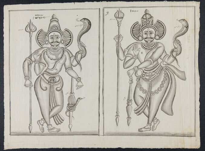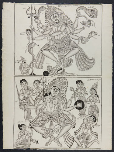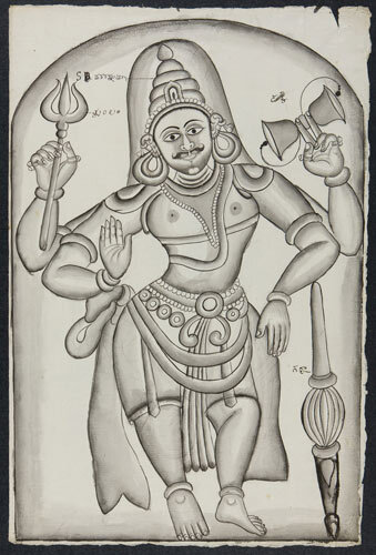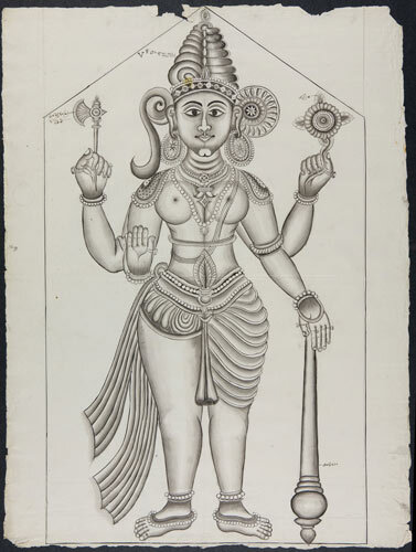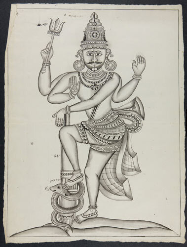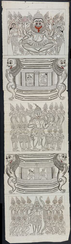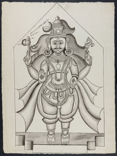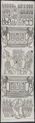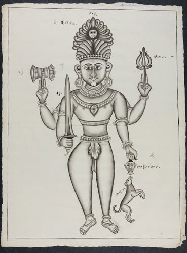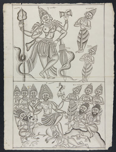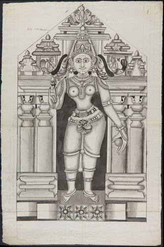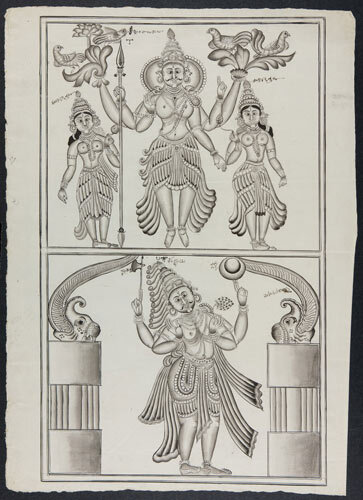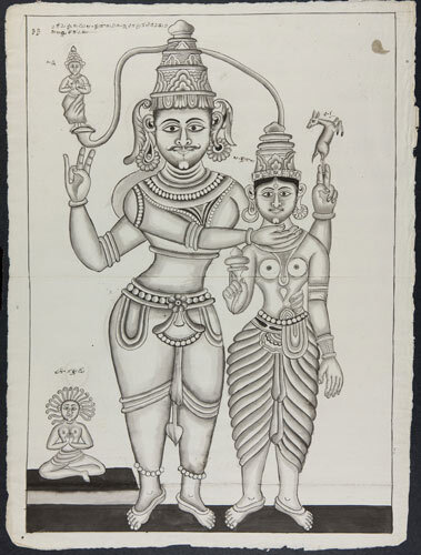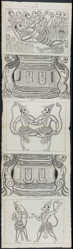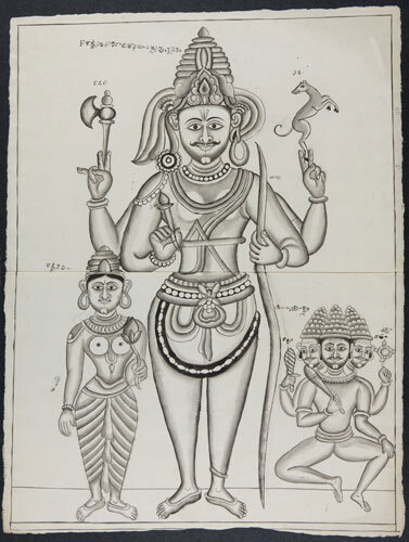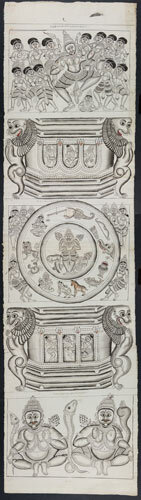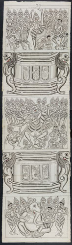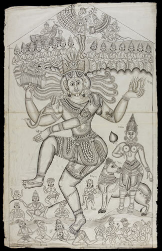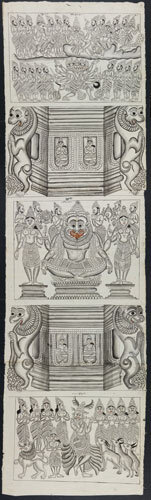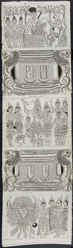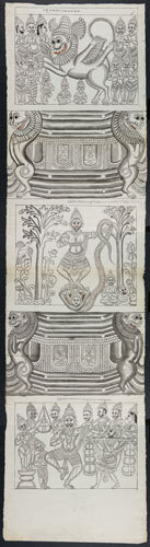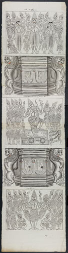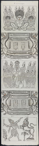 Tekening van een tempelreliëf: Hindoe godheden Shiva...