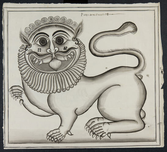 Tekening van een tempelreliëf; leeuw naar links