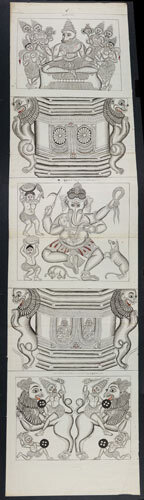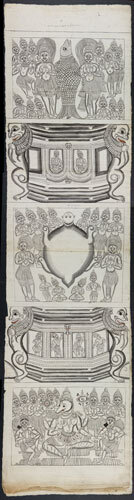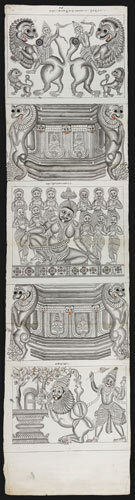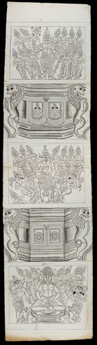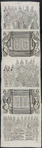 Tekening van een tempelreliëf: 5 panelen, waarvan 3 ...