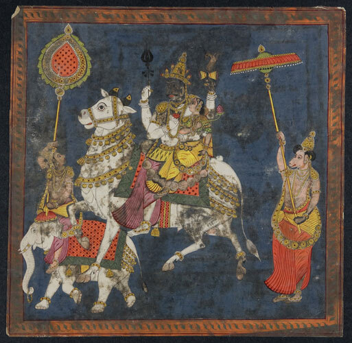 Hindoe godheden Shiva en Parvati rijdend op een stier