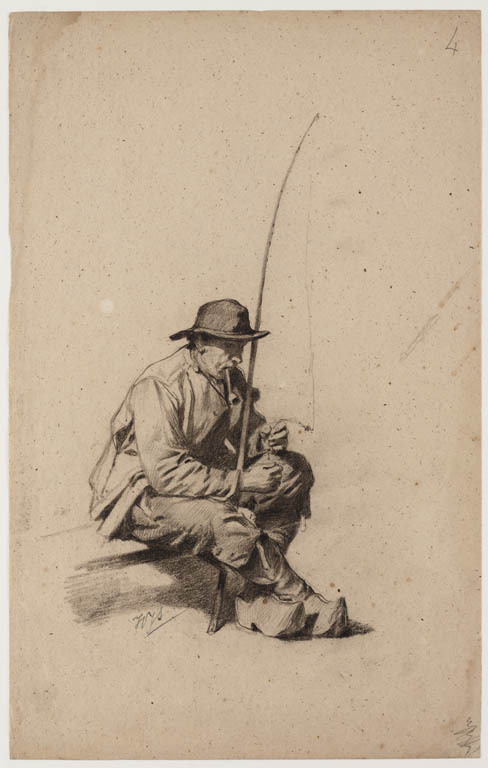 Zittende man met hoed, pijp, klompen en een hengel