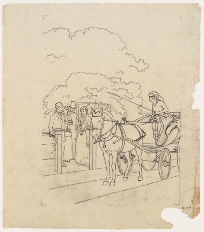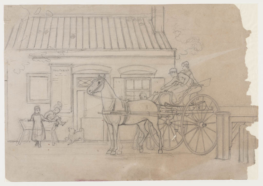 open paardekoets bespannen met één paard bij tolhuis