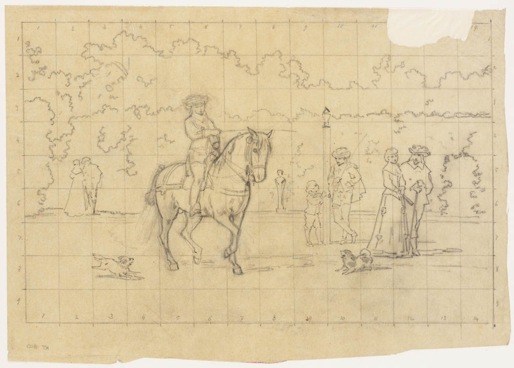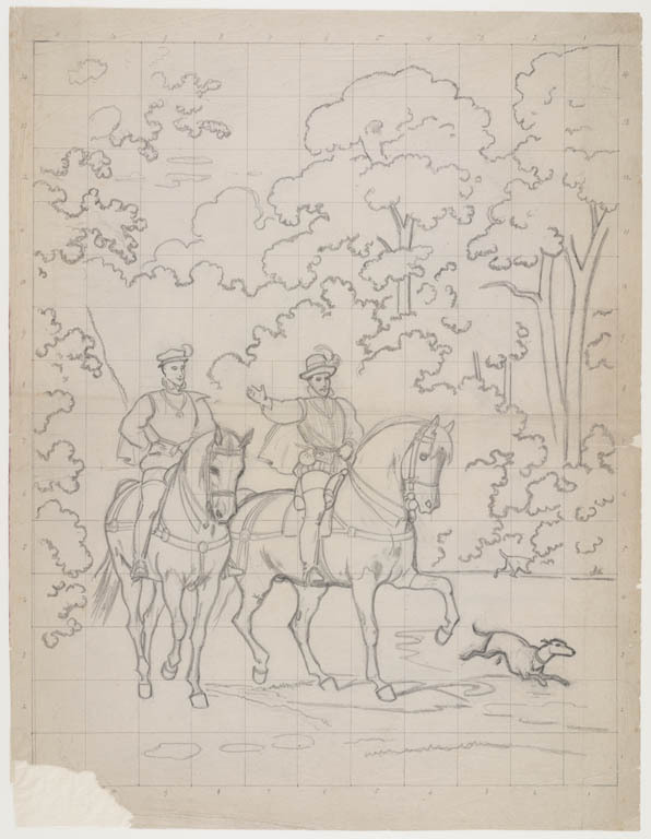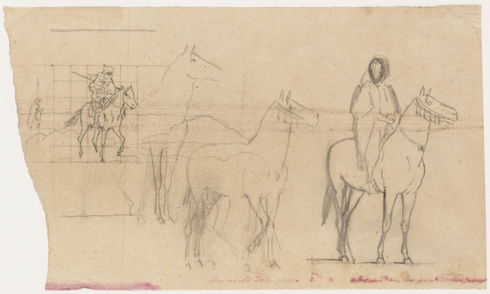 twee schetsen van ruiters te paard en twee paarden