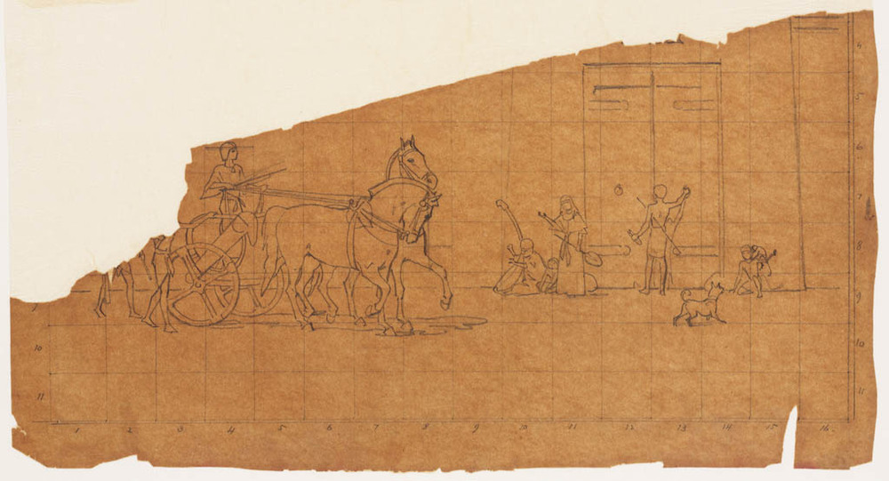 werktekening van een ezel op bas-relief te Thebe