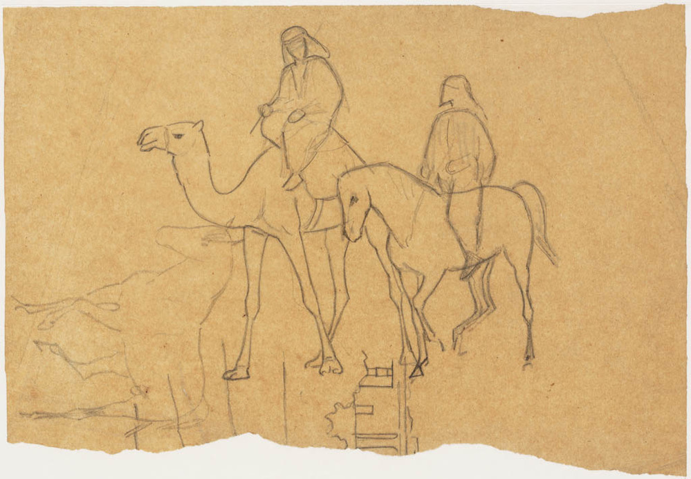 schets van een paard en een kameel met ruiters