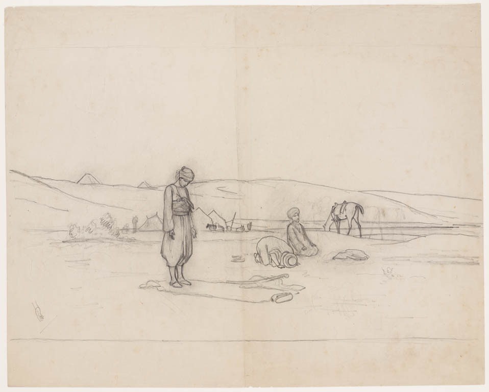 Oosterse vrouwen met waterkruiken bij rivier ; omkaderd