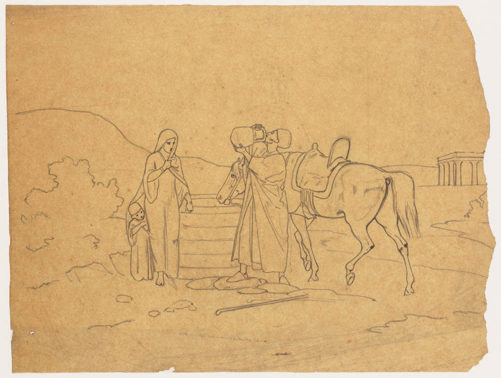 waterput met paard, man vrouw en kind in landschap