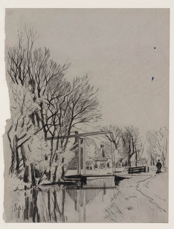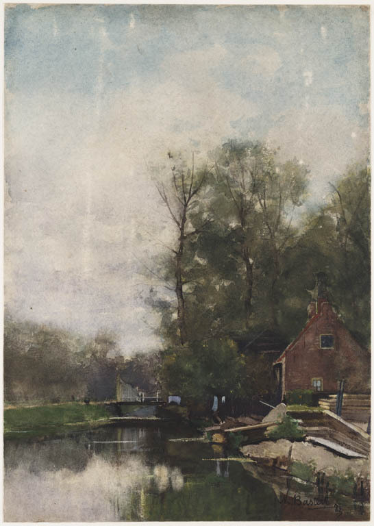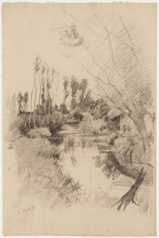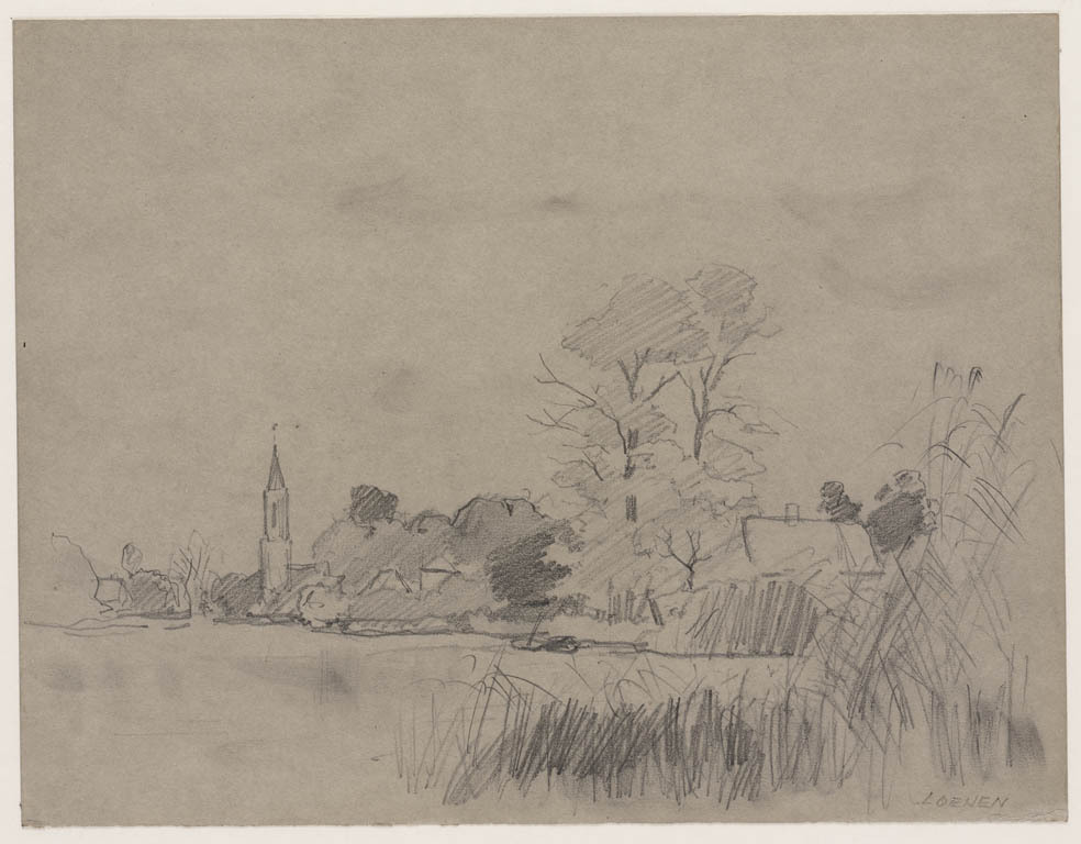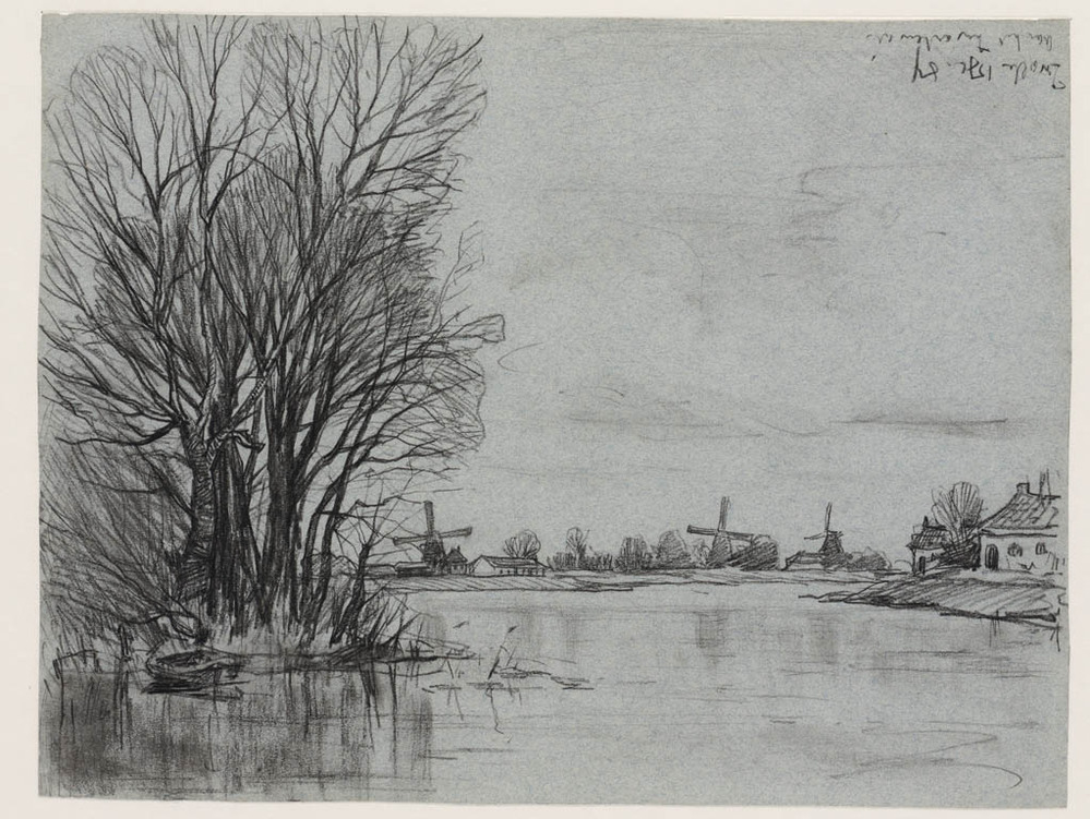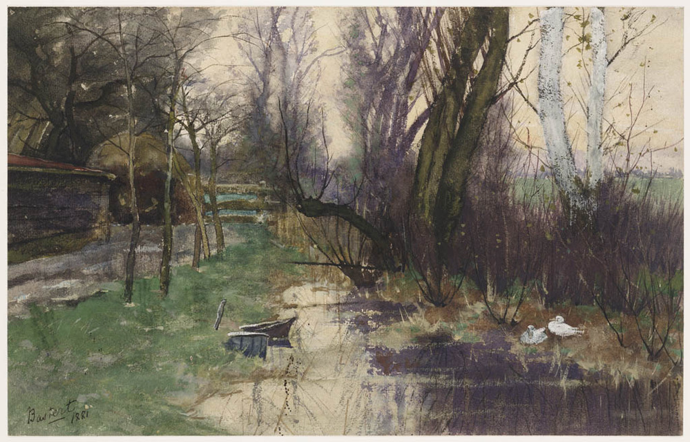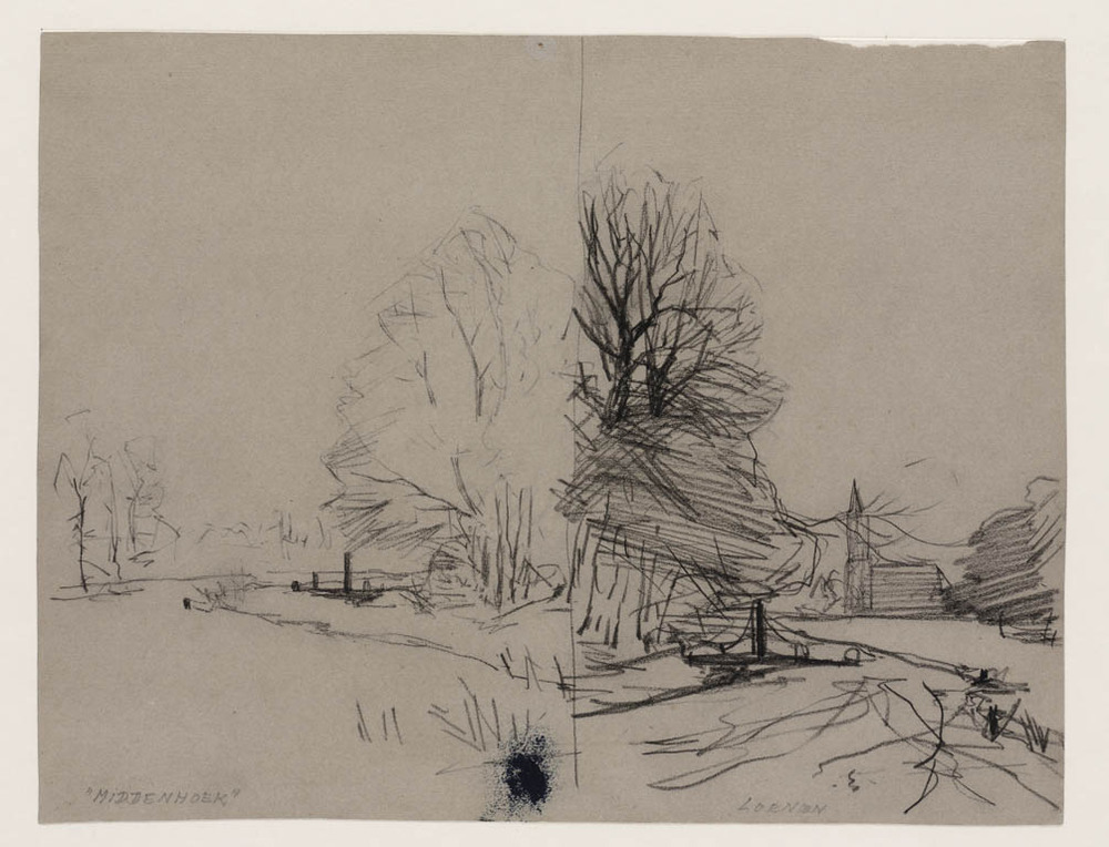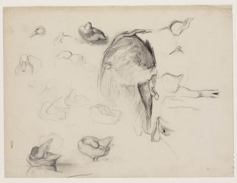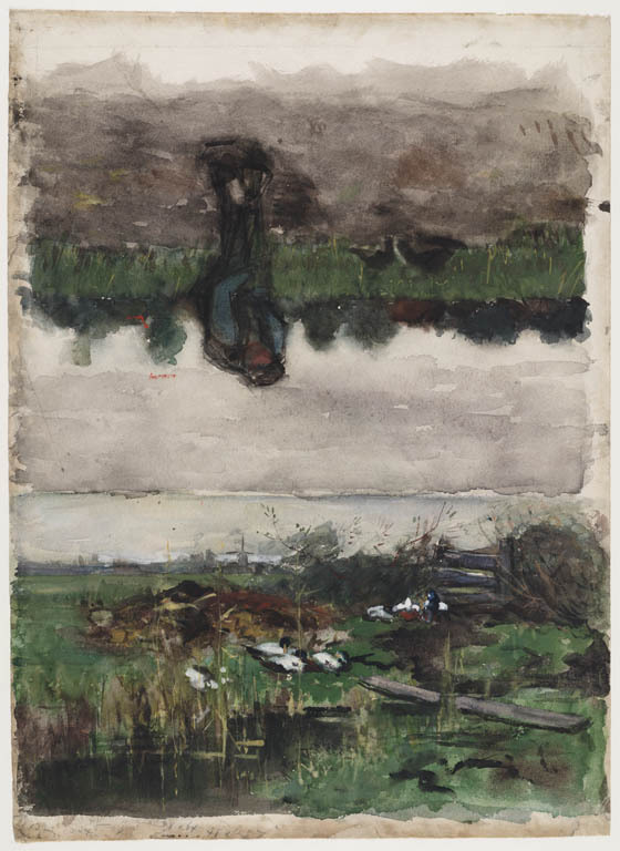 Tweedelige tekening: Landschap met eenden aan de slo...