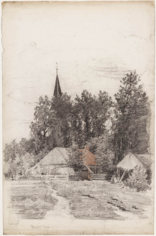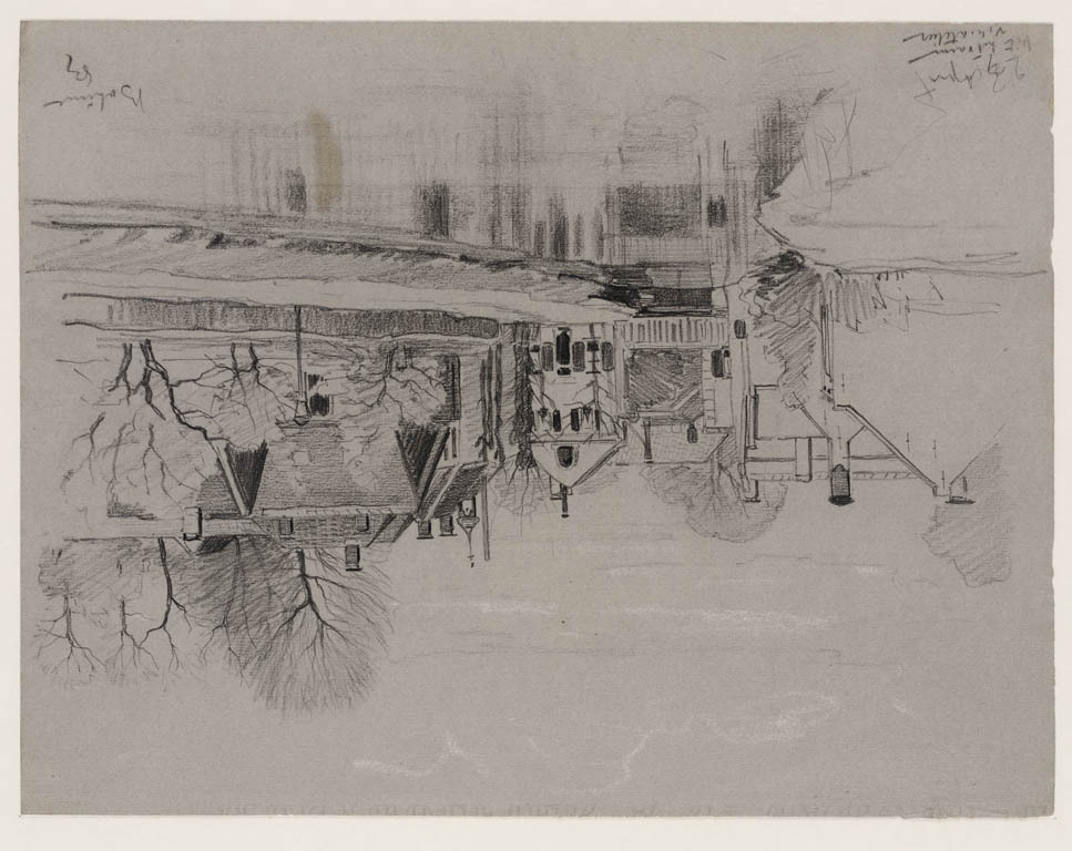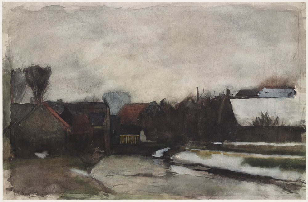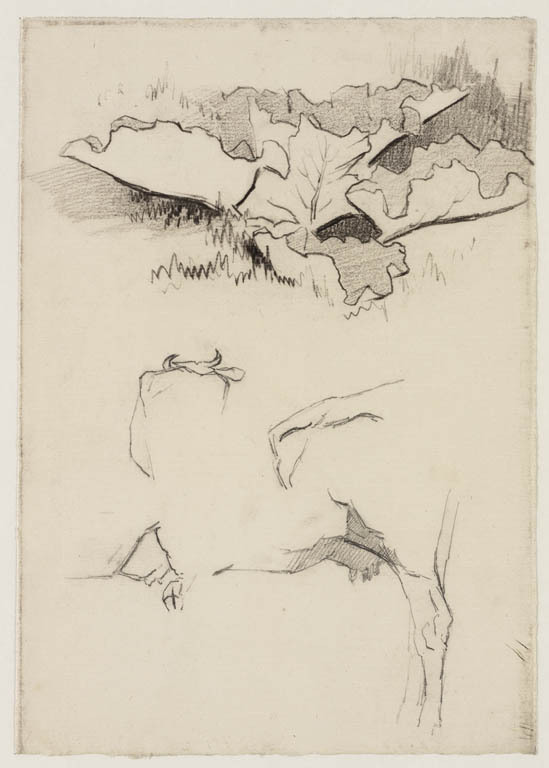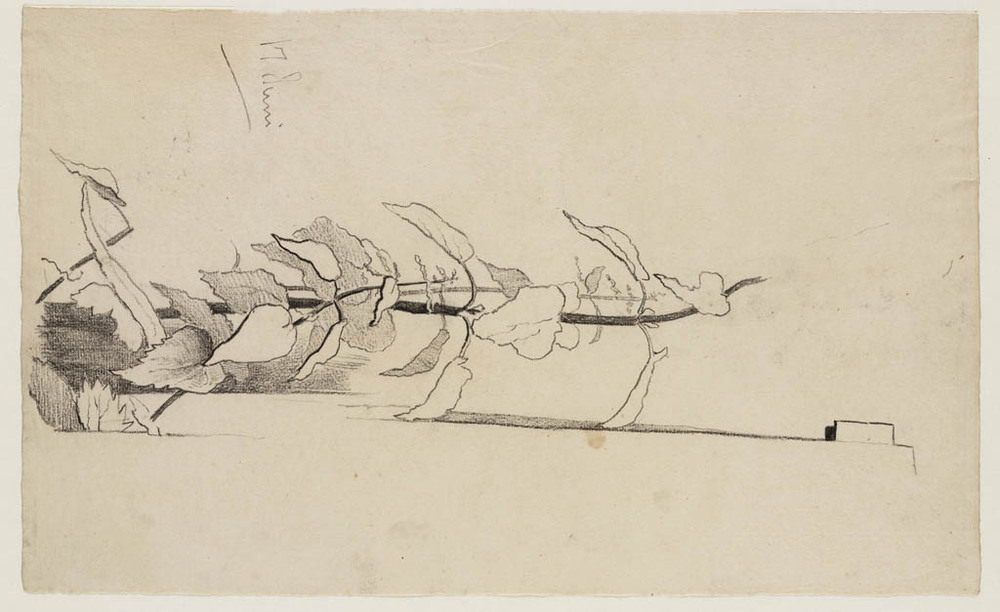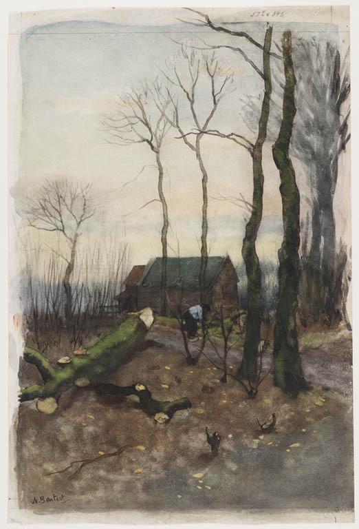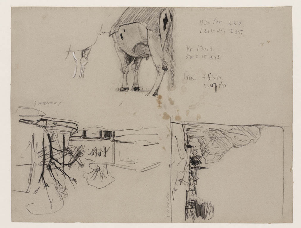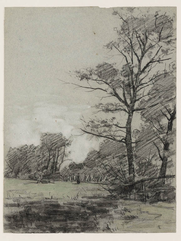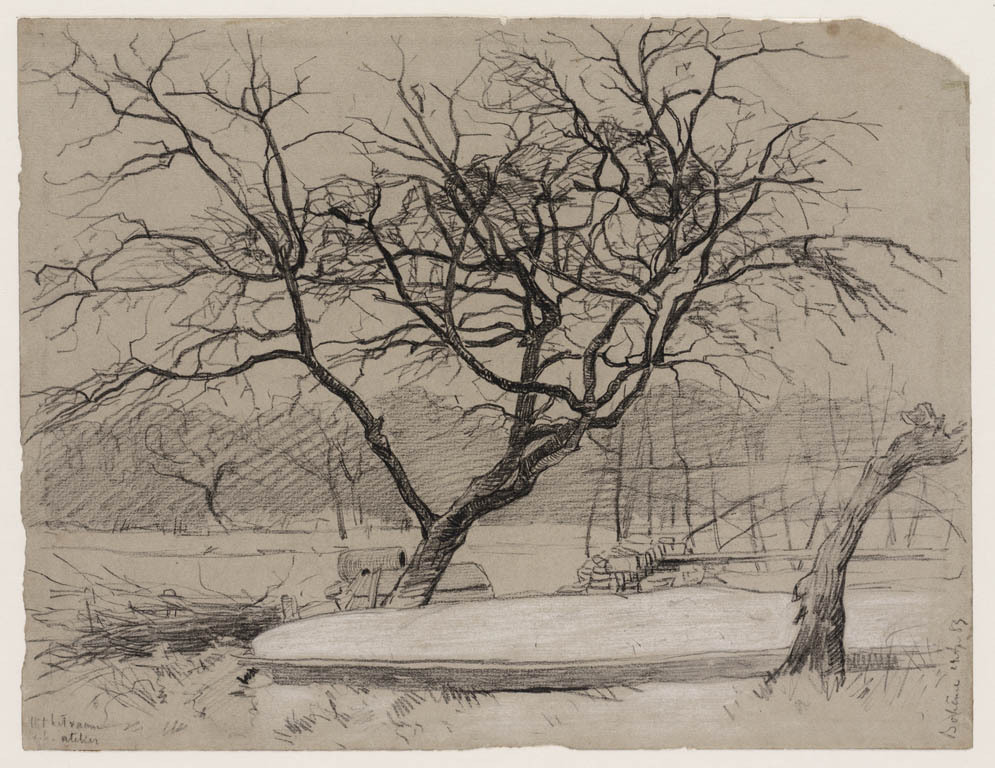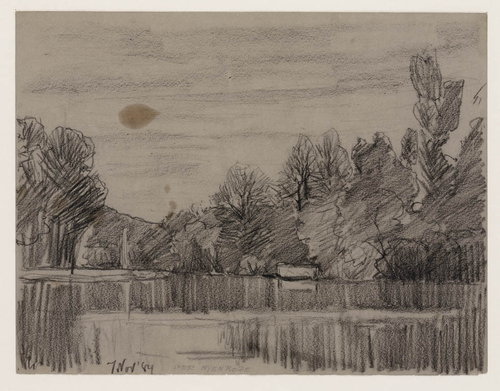 Tweedelige tekening: Landschap met eenden aan de slo...
