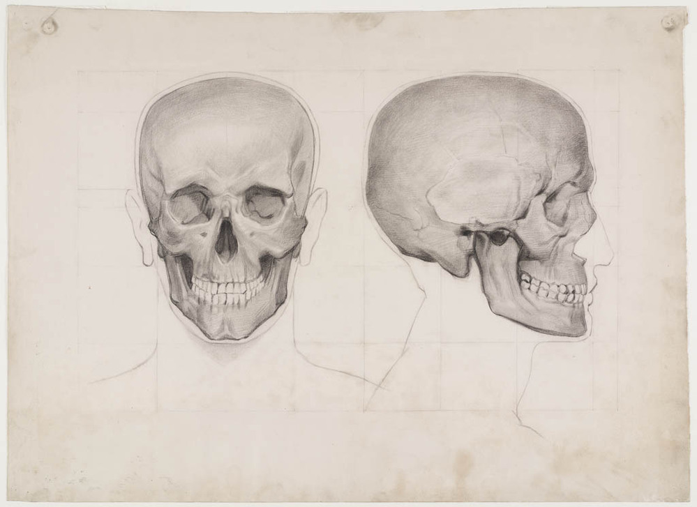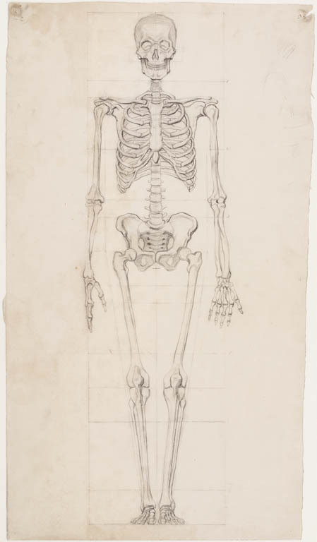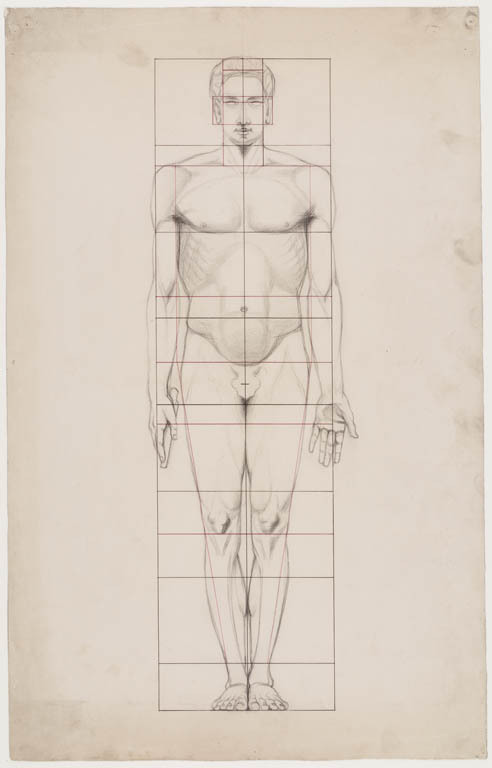 Naar een gipsmodel van een staand manlijk naakt met ...
