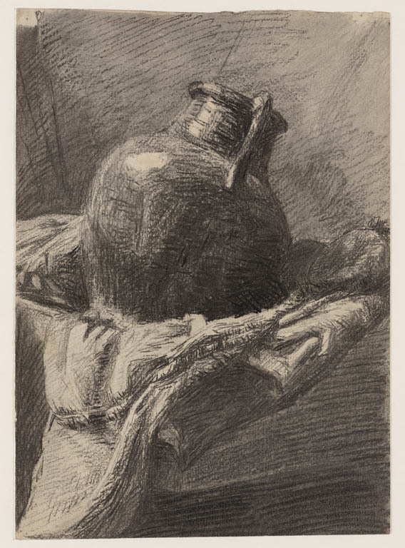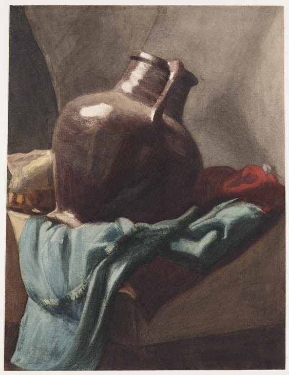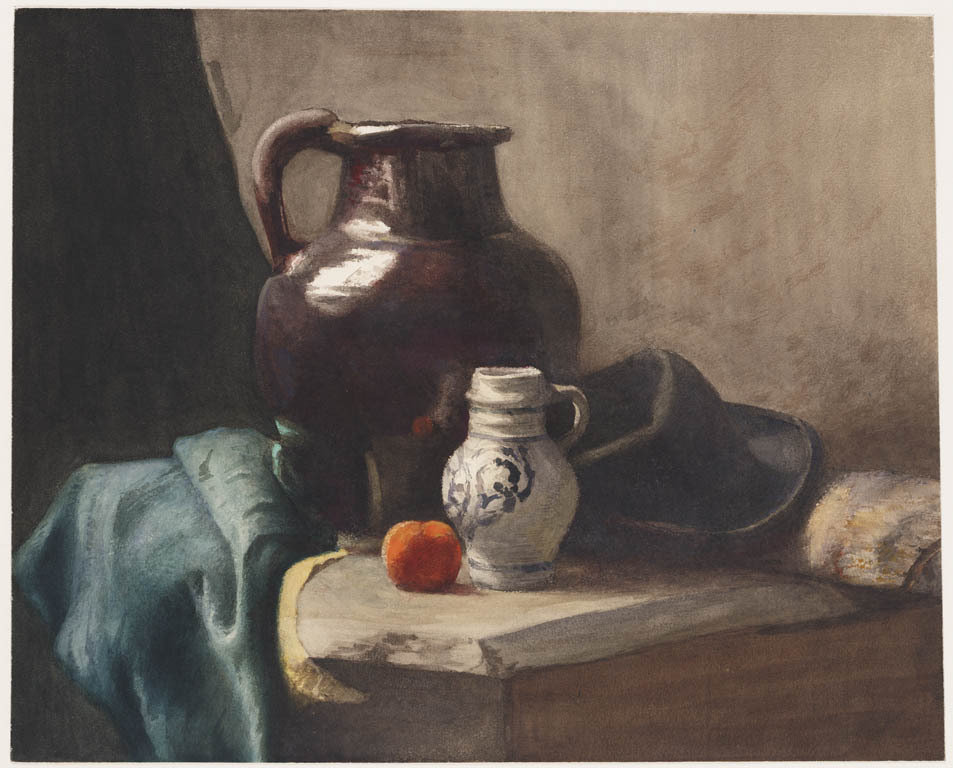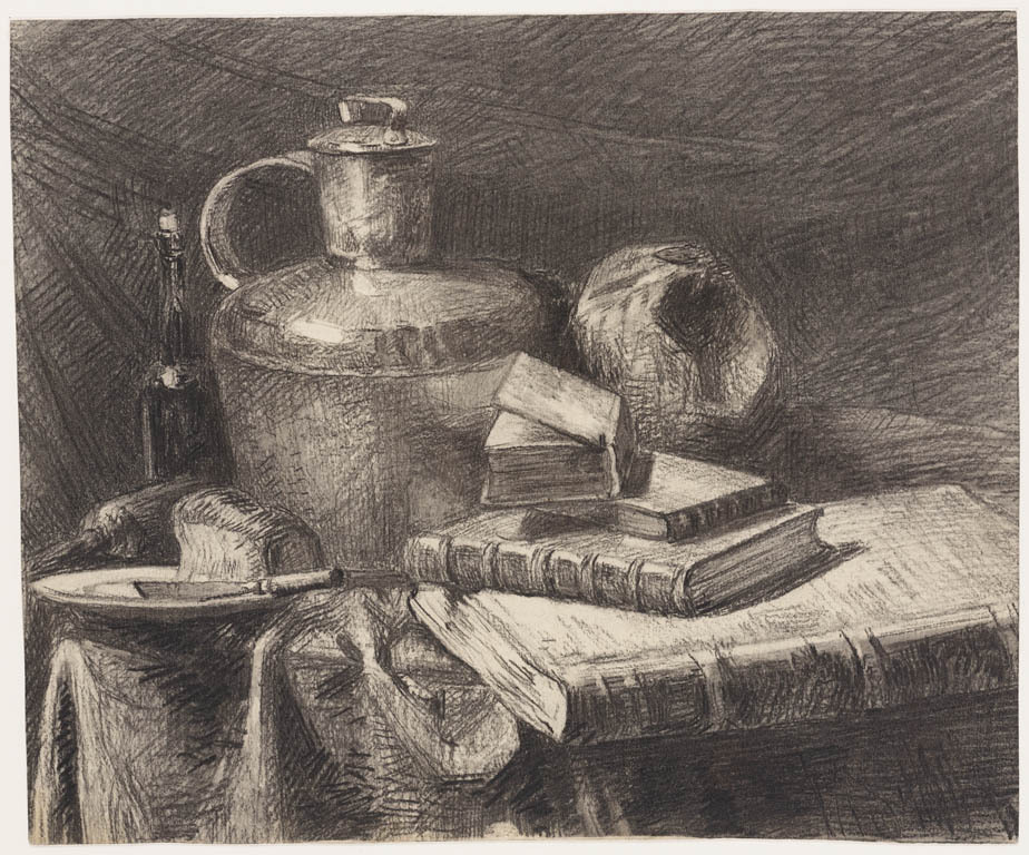 Stilleven met een kan, boeken, een bord, een mes en ...