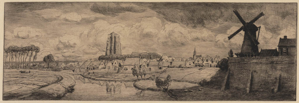 Gezicht op een dorp met knotwilgen