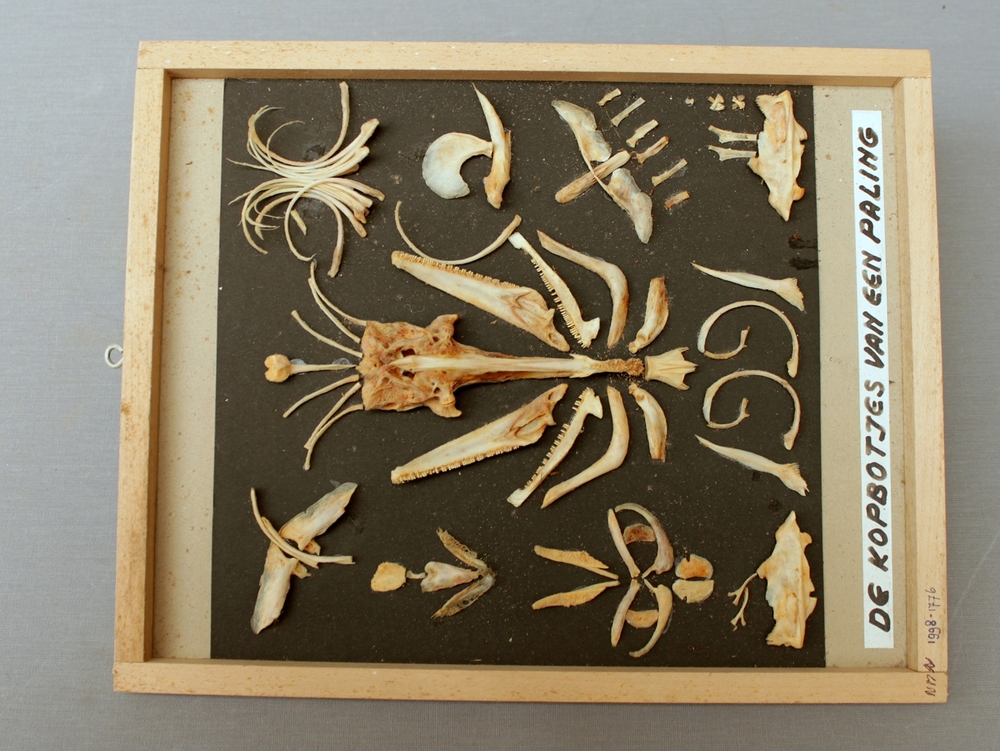 Paling; schedel in onderdelen; op plank gemonteerd