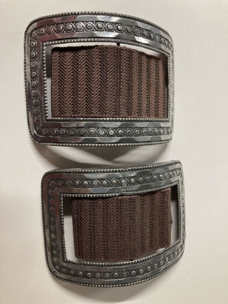 Paar grote zilveren rechthoekige schoengespen aan br...