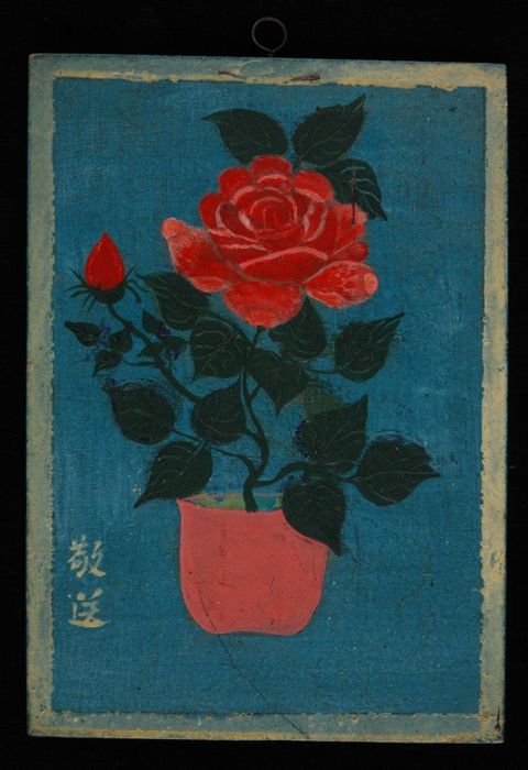 Schilderij met bloemstilleven en Chinees opschrift