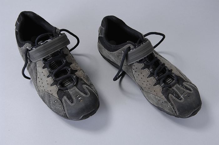 Een paar grijs met zwarte fiets-, en wandelschoenen