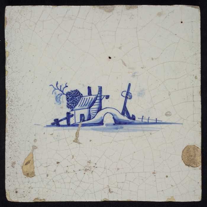 Tafereeltegel, blauw, brug en herberg, geen hoekmotief