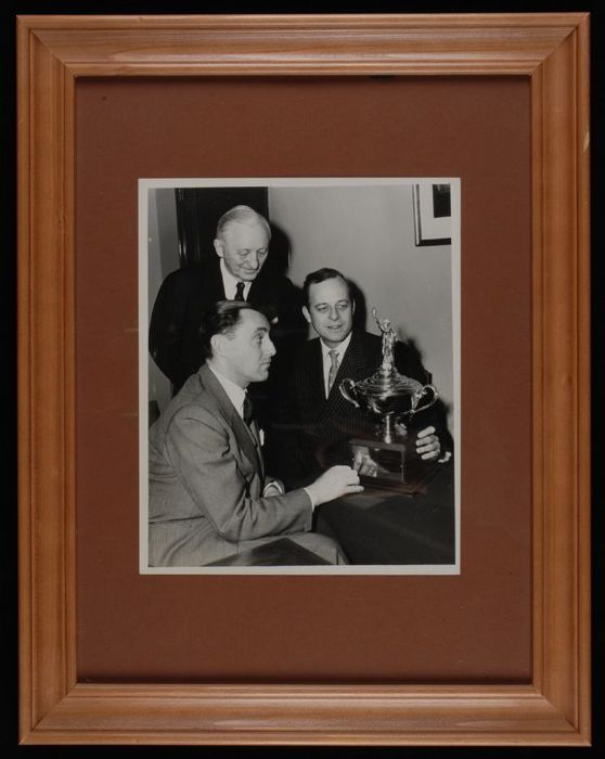Foto van drie heren met bokaal met Vrijheidsbeeld op...